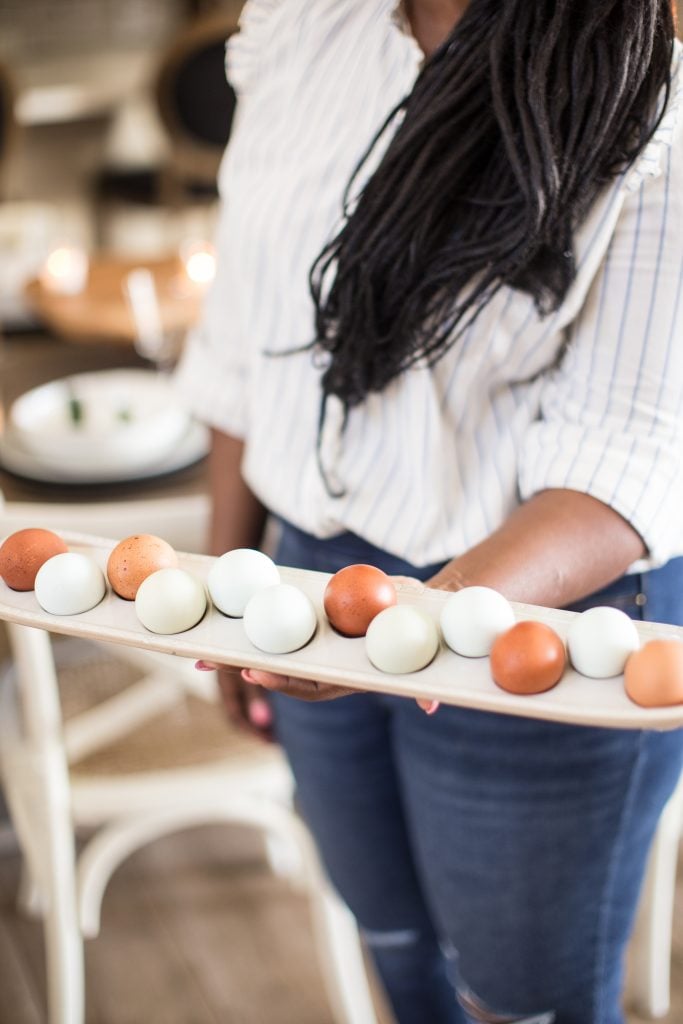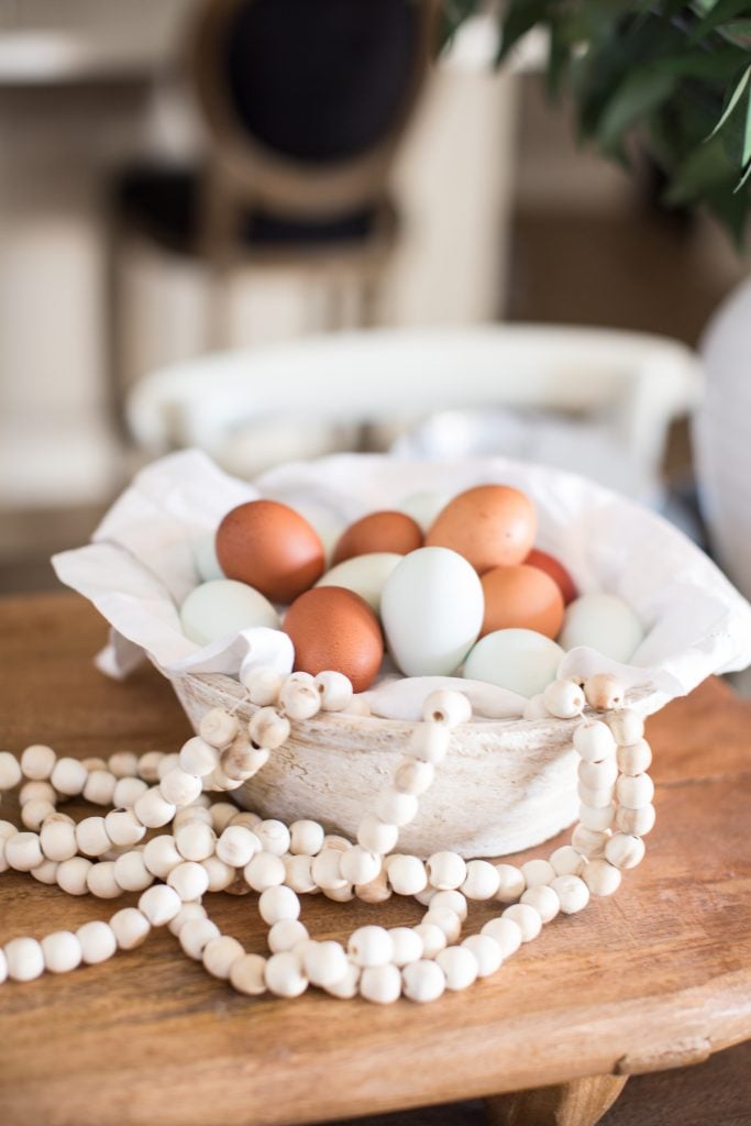 Tip: If you don’t have enough eggs to fill the entire bowl, use paper or plastic on the bottom, cover it with a linen napkin and fill it up with eggs. This gives the bowl an instant lift!