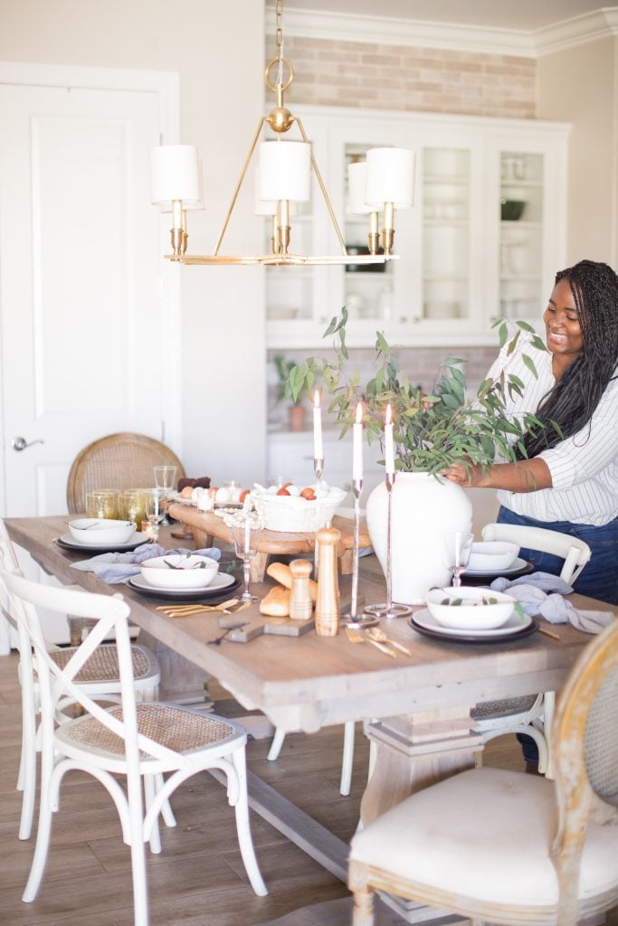 To start I layered a collection of black chargers , blue/gray plates and rustic white bowls. For this setting I felt like the black charger was the perfect piece to ground the entire table. Adding anything black instantly gives the table a rustic feeling without going too dark. Then I added some clipped stems to top things off.