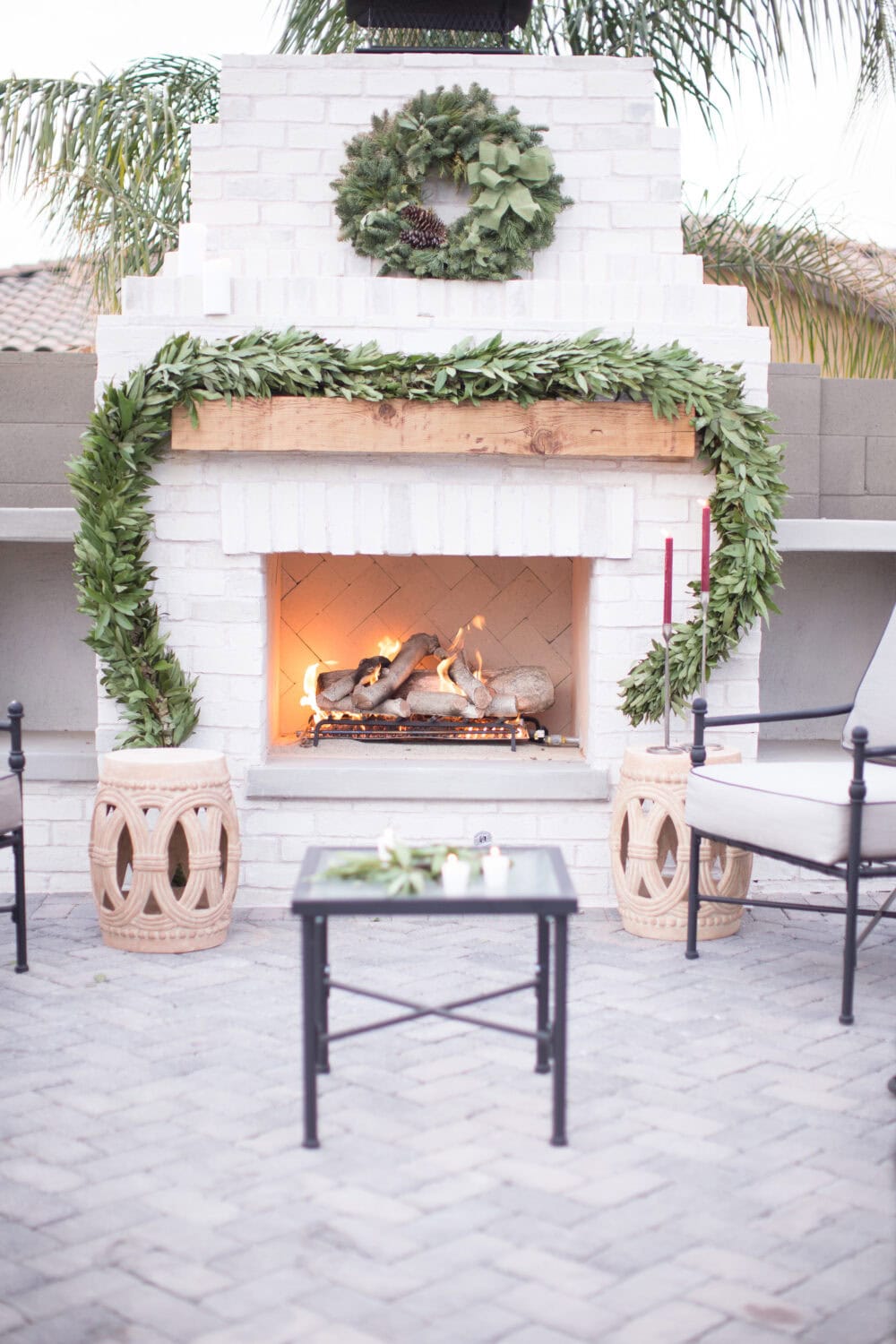 For the first time, we lit up our outdoor fireplace! Even though Arizona evenings aren’t too chilly, it’s the perfect backdrop for a little holiday magic. I draped our Thanksgiving garland across the mantel and topped it with a fresh Lynch Creek Wreath.
