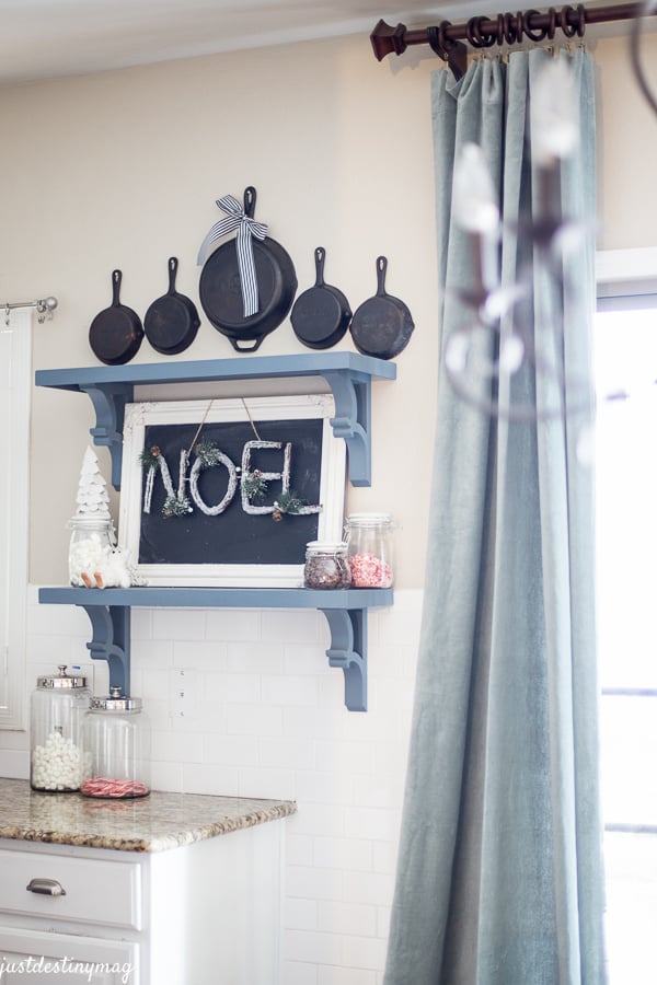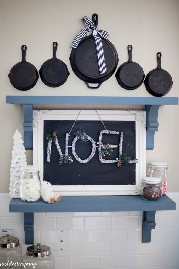 When it comes to dressing up the kitchen for Christmas each year I keep things pretty simple. We have a pair of open shelves that are the perfect spot for all things seasonal. I cleared everything off a few months ago because I wanted something fresh. SO for Christmas I added a few things from World Market. My favorite is me little display of cast iron skillets. Who knew my pizookie making obsession would leave me with a sweet little collection! I also added a cute chalkboard and a NOEL sign from the Winter Soiree Collection.