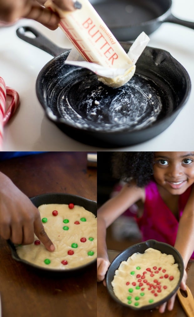 First butter up your pans for an easy nonstick coat. Then have your kids press the sugar cookie dough into the mini pans. I think about 1/2 cup of sugar cookie dough is just enough. Make sure that it’s not to thin. If you start to see the bottom of the pan then that;s too thin. Once they have a nice and even coat have them add some candy by pressing it into the dough. This is a great time to have them help. They really feel like they are making their own little dessert. It’s so awesome to see them take pride in what they’ve done.