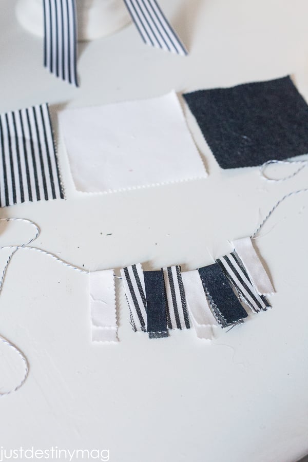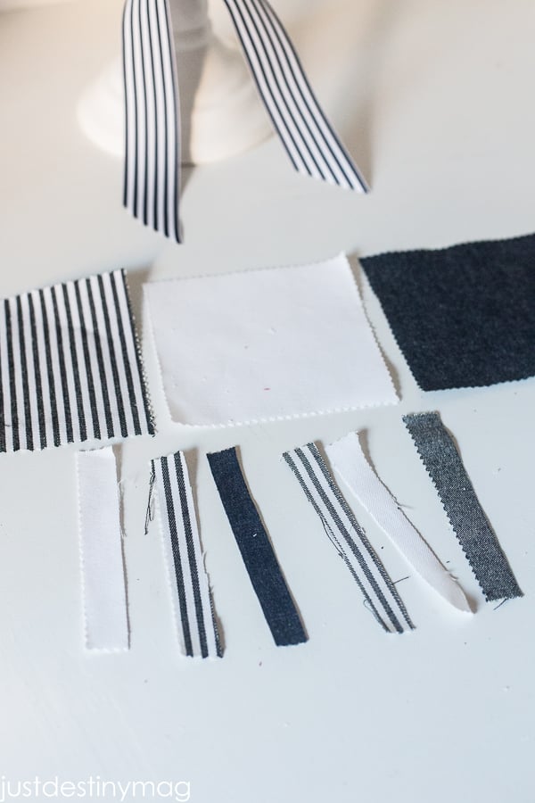 Use denim ribbon or quilt patches and cut 1 inch stripes.