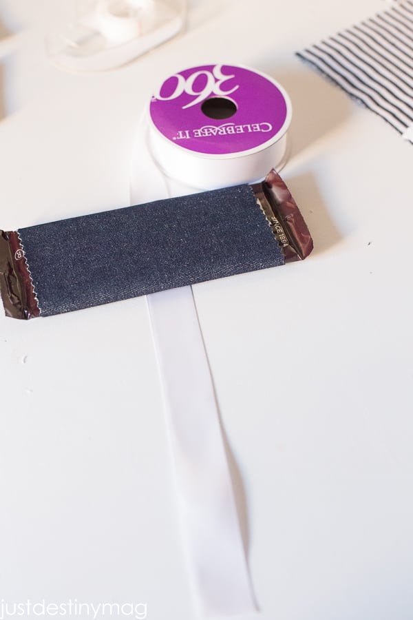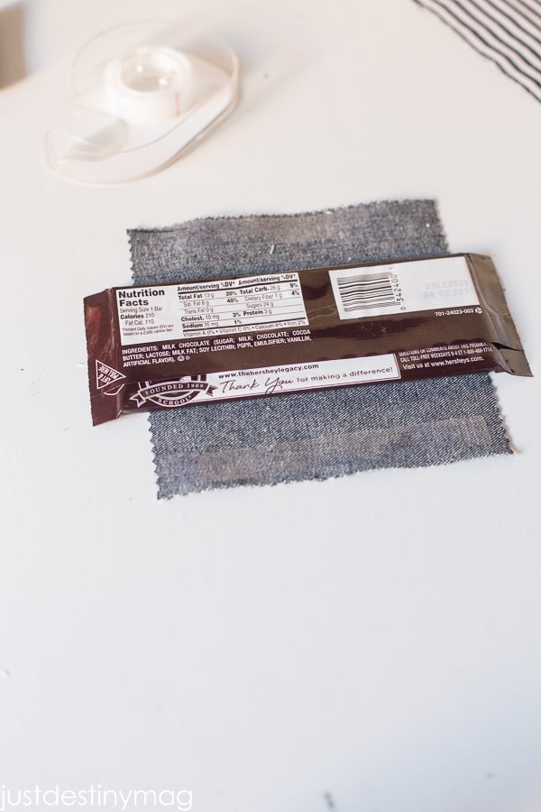 Turn the denim square on the wrong side and and use double sided tape to adhere the denim onto the candy bar.