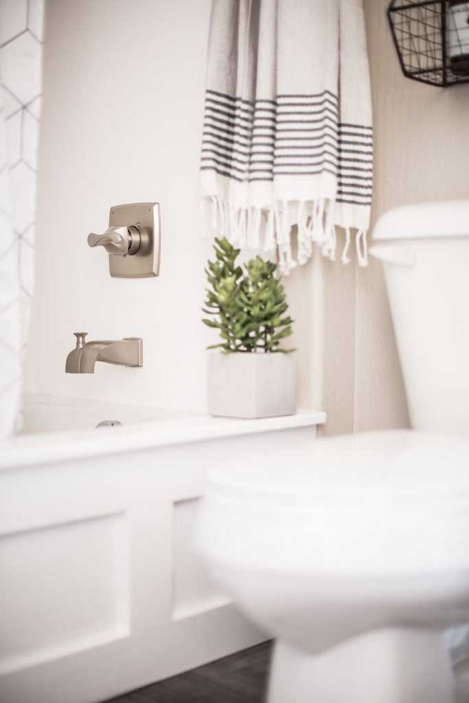 Excited to show you all part one of the boys bathroom makeover today! I teamed up with Home Depot, Delta Faucets and Smart Tiles, to give my boys bathroom a two part makeover! A detailed bathroom update in one weekend is very doable if you focus on the smaller areas of the bathroom like towel bars, a new faucet and even a shower head switch!
