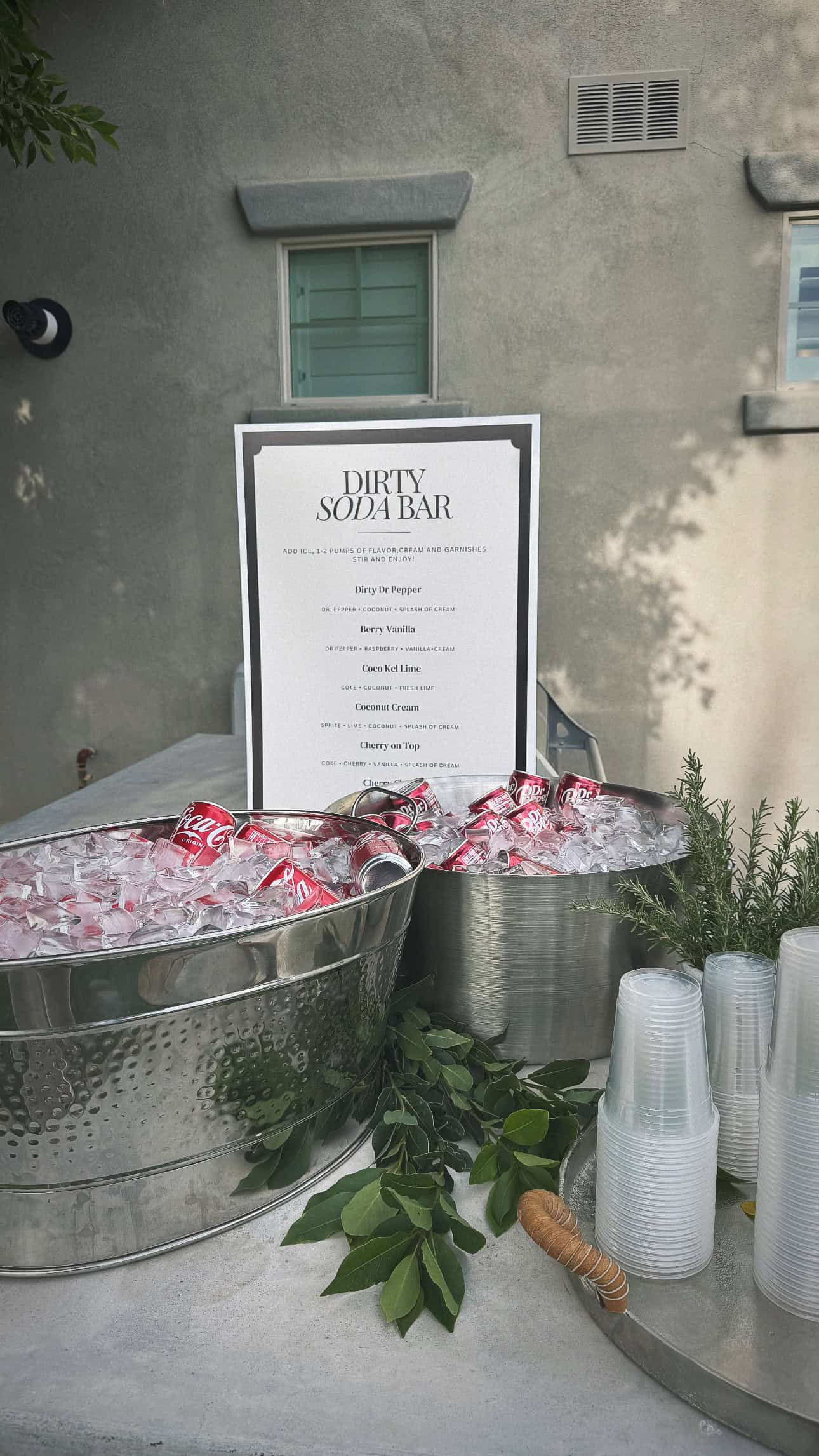 Here’s everything you’ll need for a well-stocked dirty soda bar. Mind you this is based off of my own personal menu I used! Feel free to add whatever you want to your grocery list.