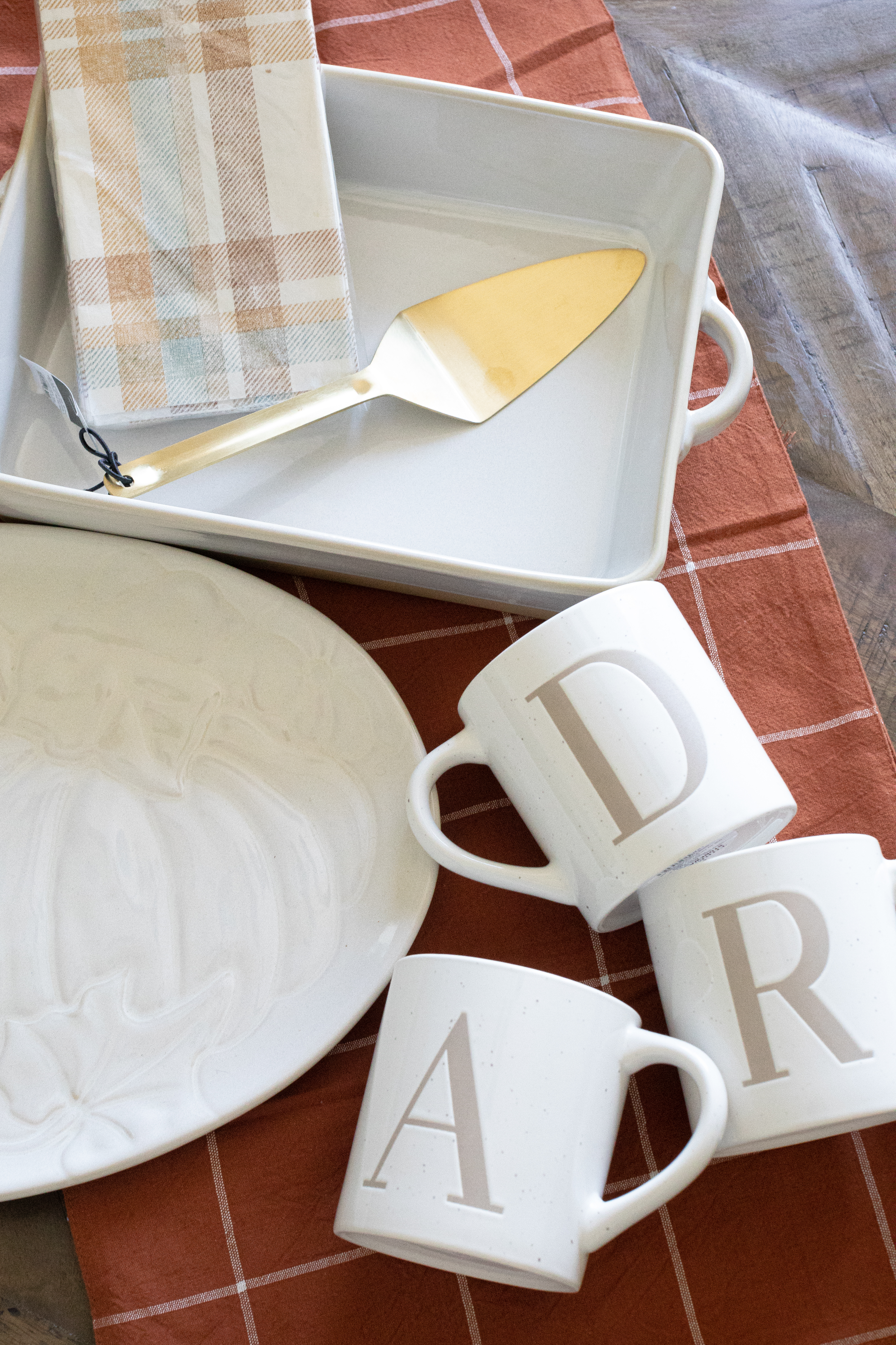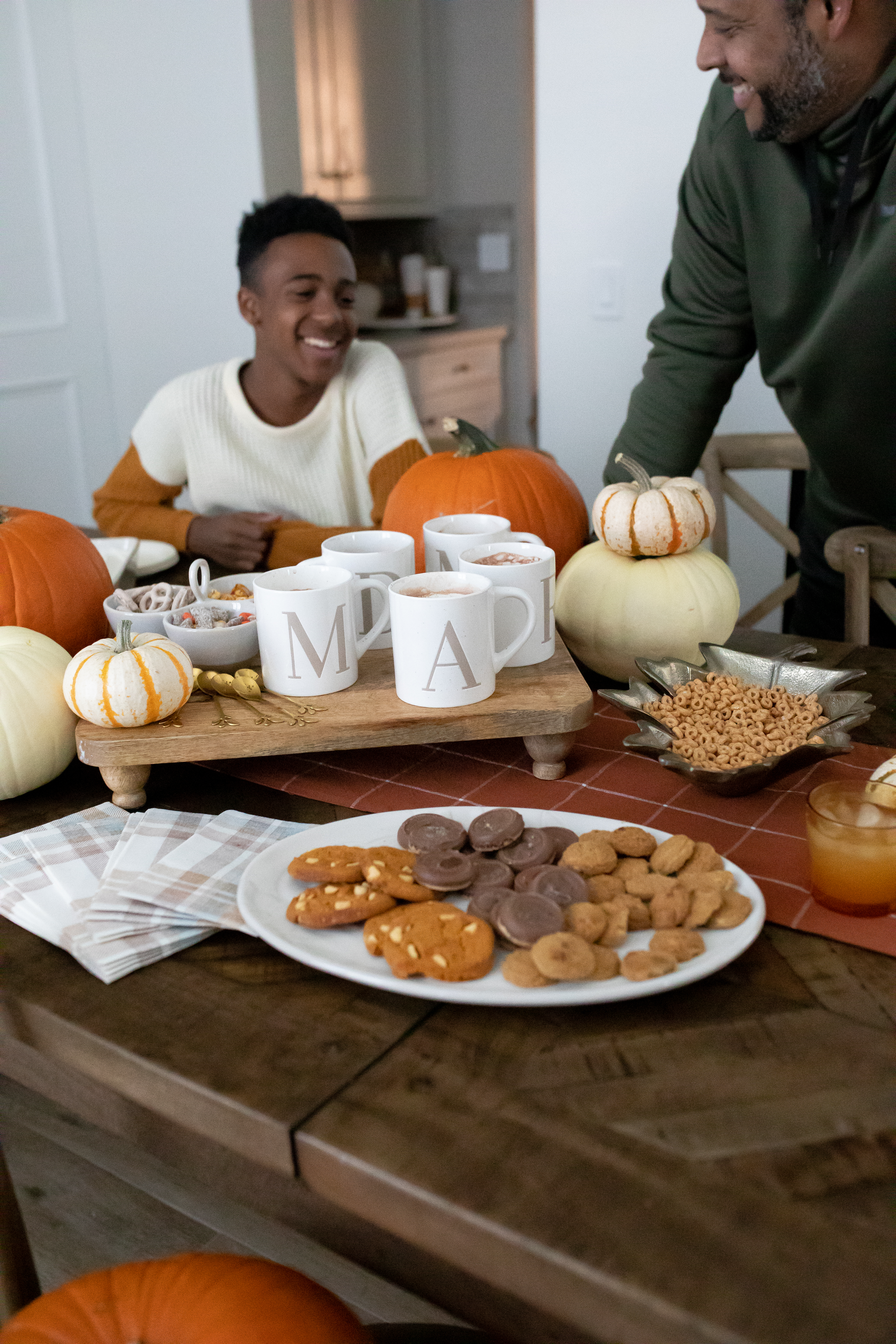 Once you have your items choose a night when everyones at home and bake any items that need to be prepared. We baked our cake in this gorgeous two tone baker (only $15) and had hot cocoa already to go in these monogramed mugs all from Target. Each one for a member of the family. Perfect to use all season long for a hot cocoa bar too.