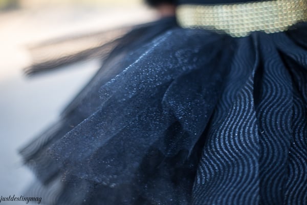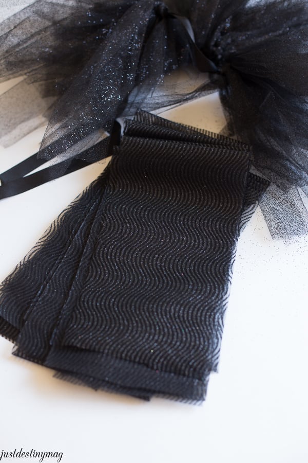 Take the black glitter tulle and black wave tulle and cut it into long pieces according to your child’s height. My pieces were 7-8 inches in length when folded in half. So 14-16 inches total.