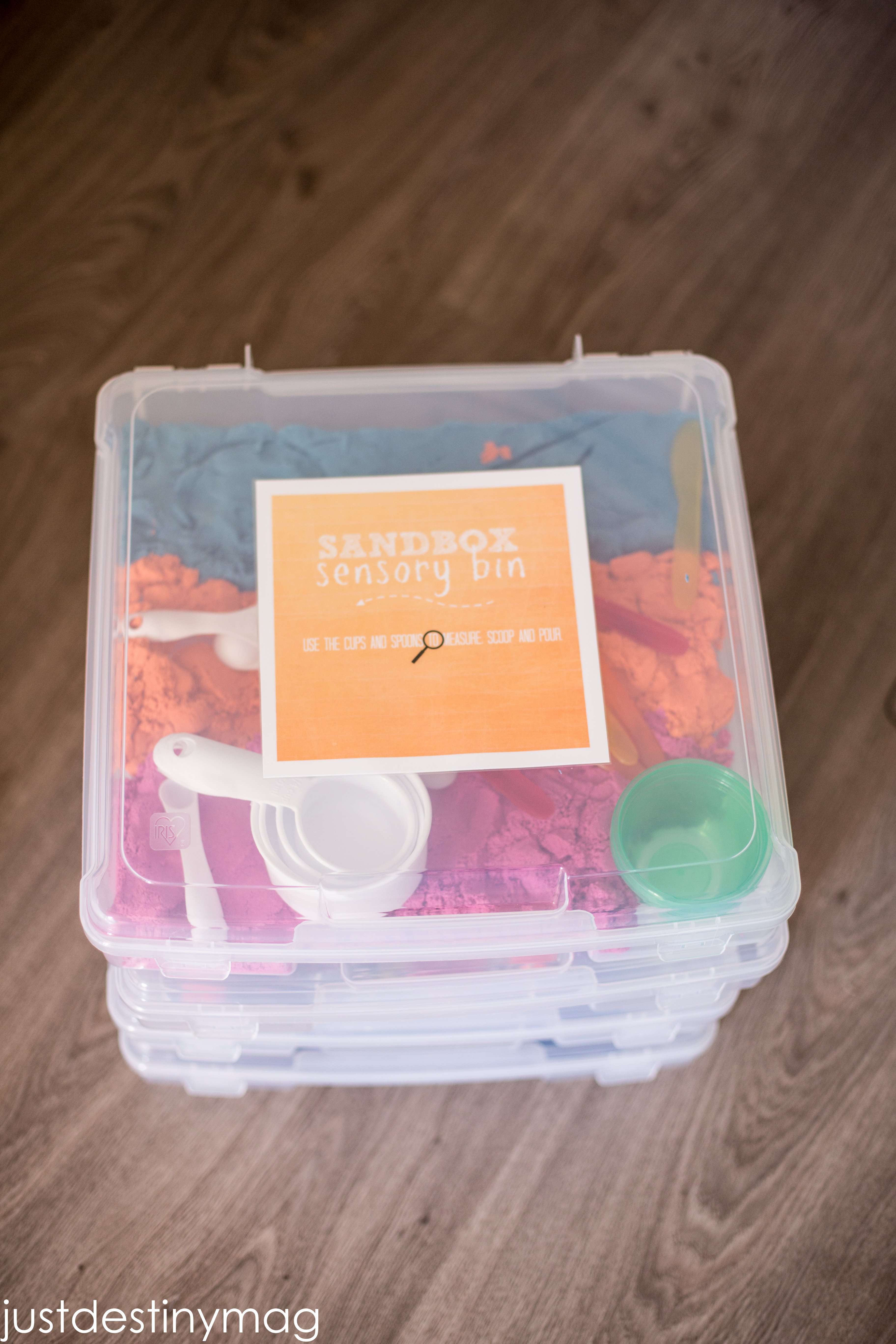 This is one of the easiest sensory bins to make for preschoolers. I used this amazing Kinetic Sand from Michaels that doesn’t dry out and doesn’t stick to hands which means less mess for the teachers! Each one of the activities are stored in these scrapbook page storage boxes for easy access and a larger range of play area. Sand play allows each preschooler to use skills of investigation and observation.