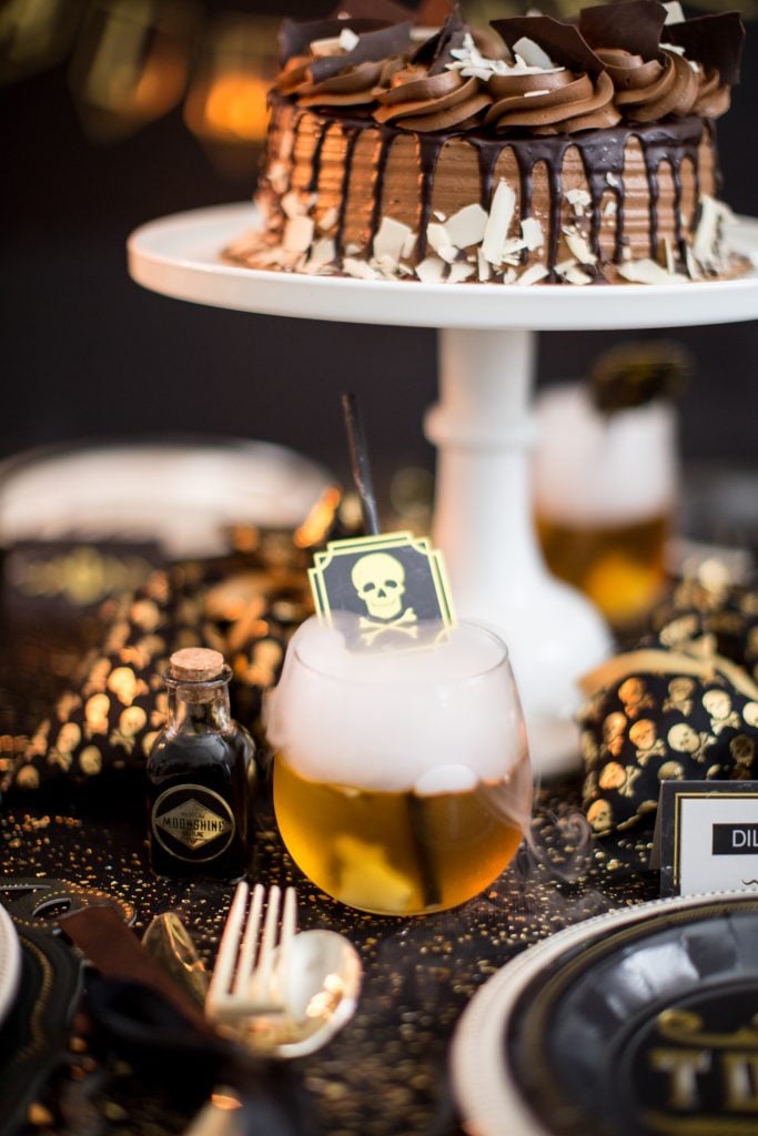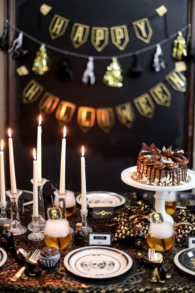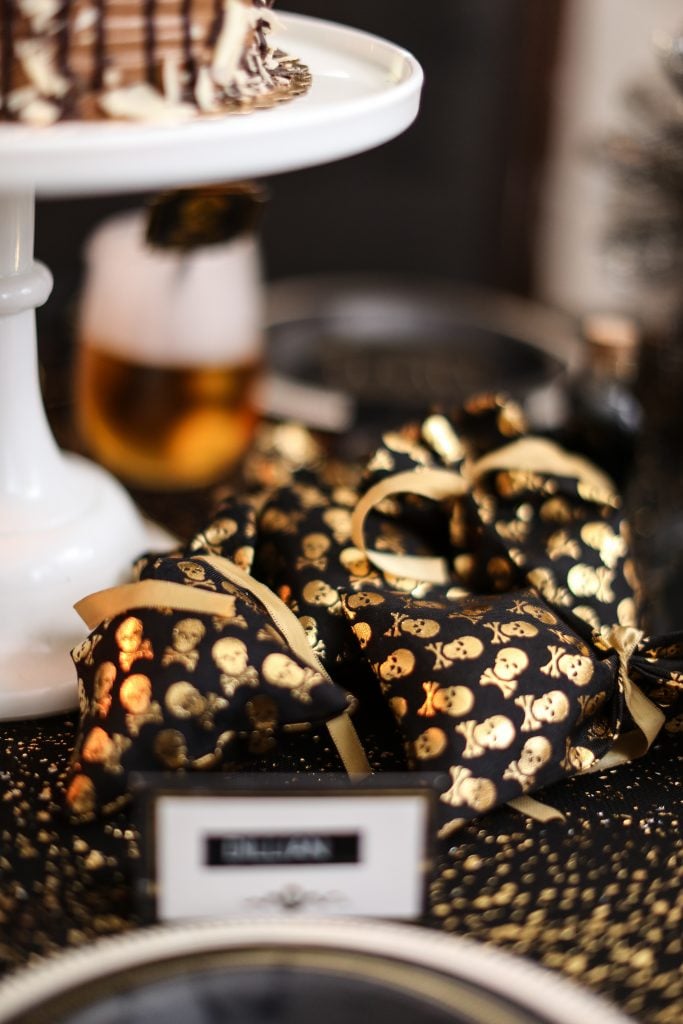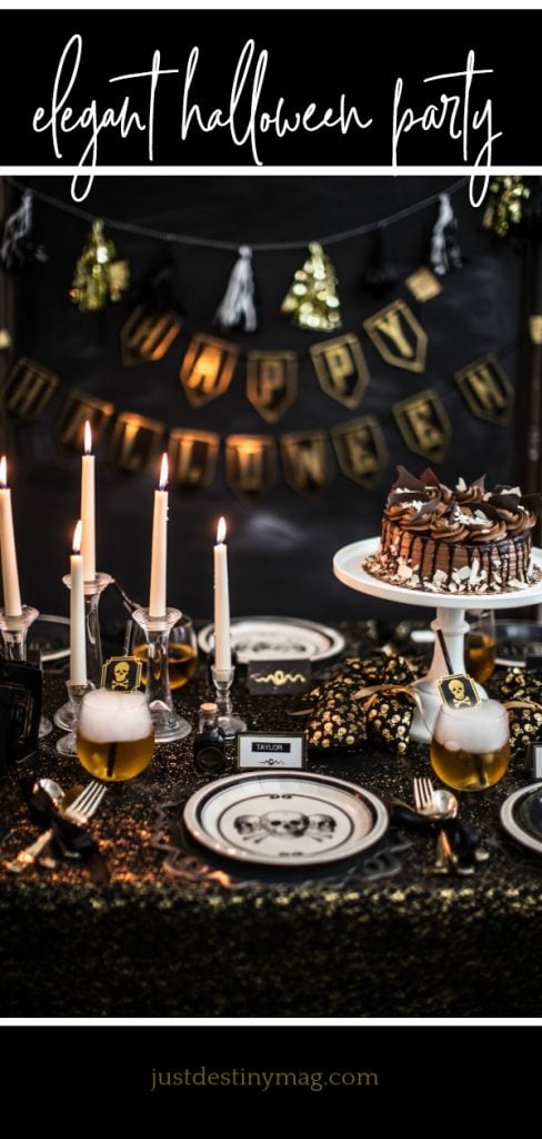 This entire collection is dripping with a sophisticated palette of black and gold which will set the stage for an elegant Halloween evening. Glittered tablecloths, candle lit table and coordinating delicious treats all with a grown up flair will take your party up a notch this October!