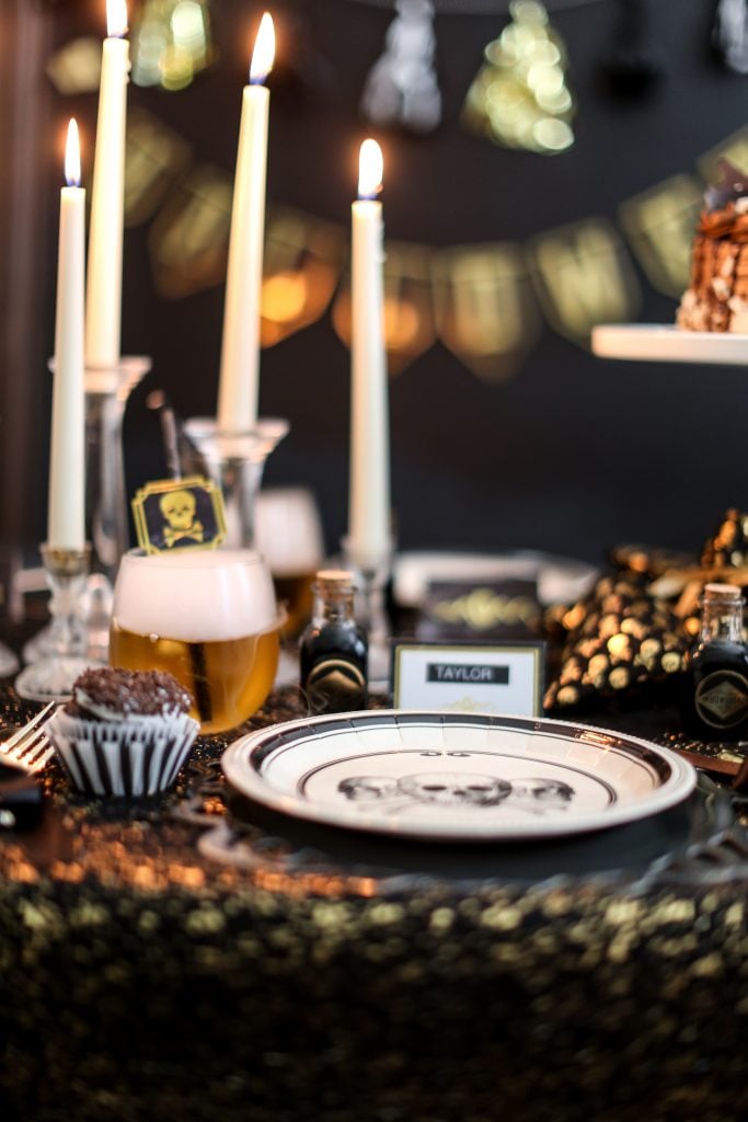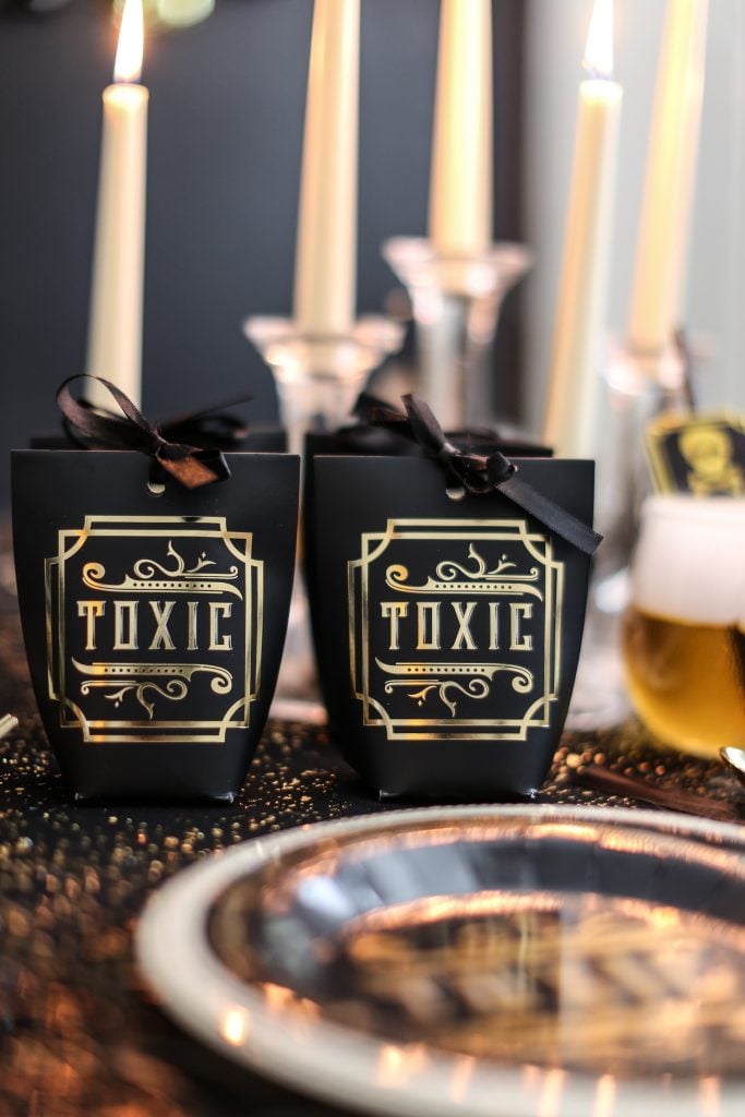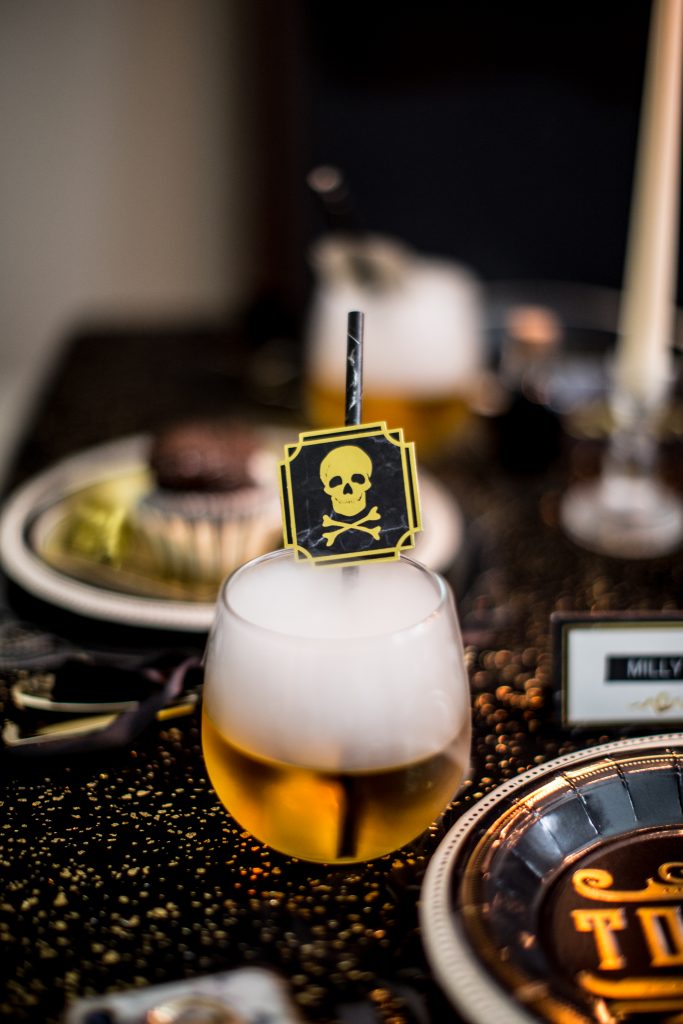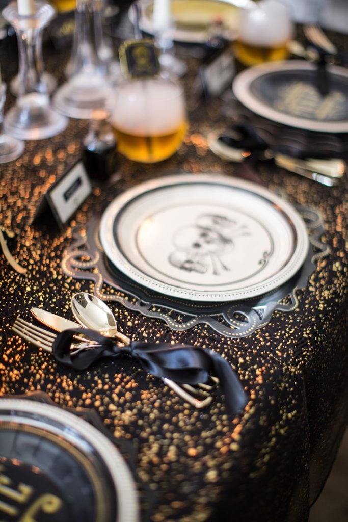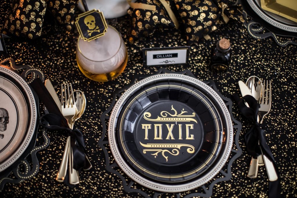 To layer the table I used the a glittered tablecloth underneath a spread of black and gold accents. I added both spiderweb chargers and scrolled charger to the toxic themed paper plates and scull themed in cream and black. This combo is the PERFECT amount of elegance and fun to start off with.