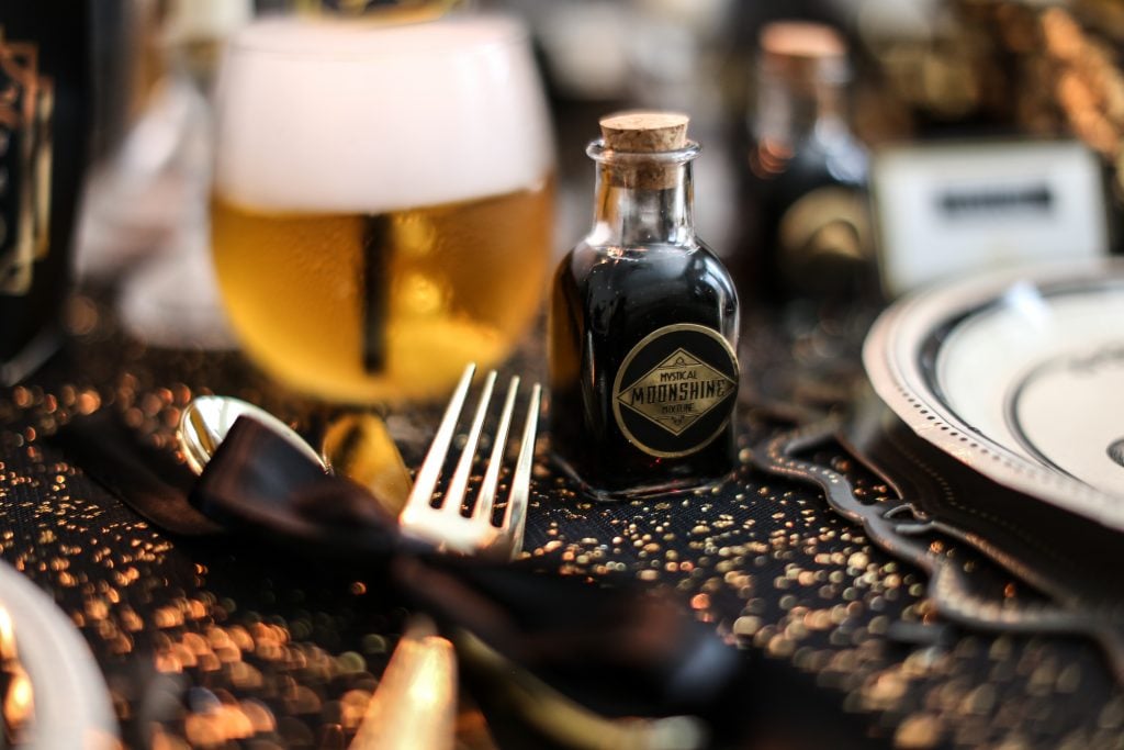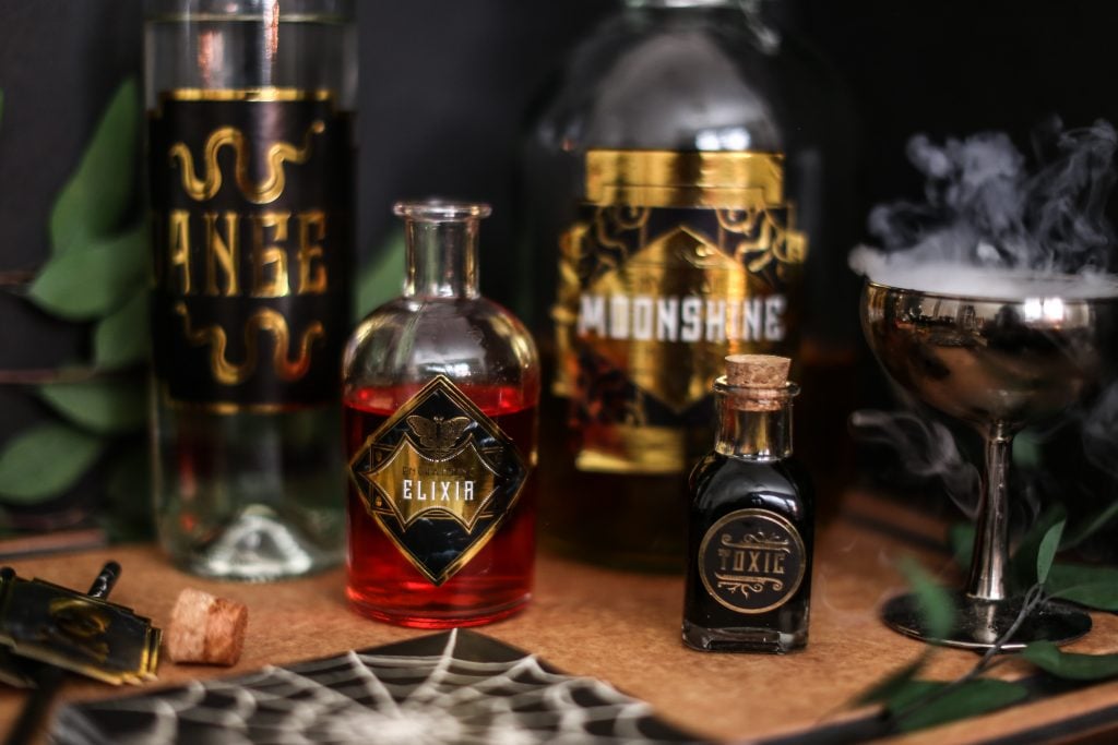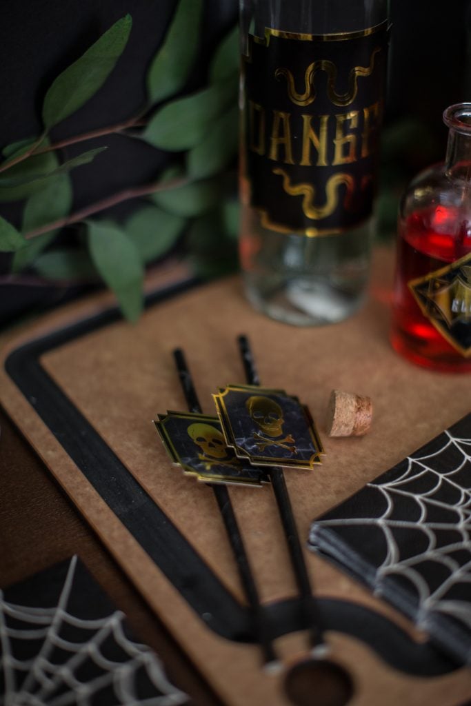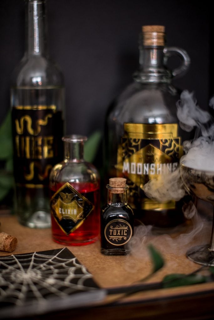 Use the beverage labels to dress up your bar like I did here! You can have the guests make their own concoction that mimics something right out of the Adam’s Family or pre make signature cocktails with dry ice cubes for a very spooky look and feel! I also found some great glass wine bottles and cork topped bottles to use for the different drinks that would be on display.
