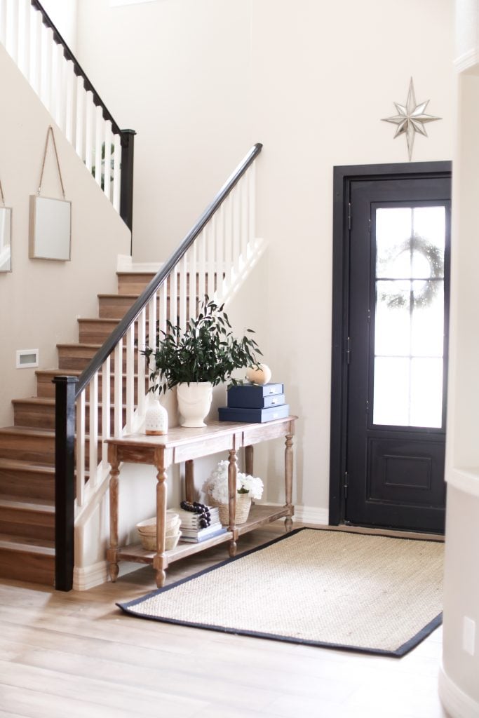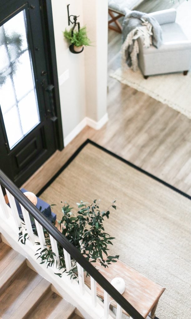 Choosing a rug for this entryway was a hard choice! I wanted something simple but somewhat stylish. My style always includes a touch of black. I think it brings a bit of definition and sophistication to the space. The jute rug has been in my house before but in different sizes. I actually had one in my last house…but I cant find it! haha! I think it got lost in the move, so I bought another one. I love how this rug can hide dirt because of the heavy texture and has the natural look that I love to include. You can see I have another natural rug in my living room right in the next room.