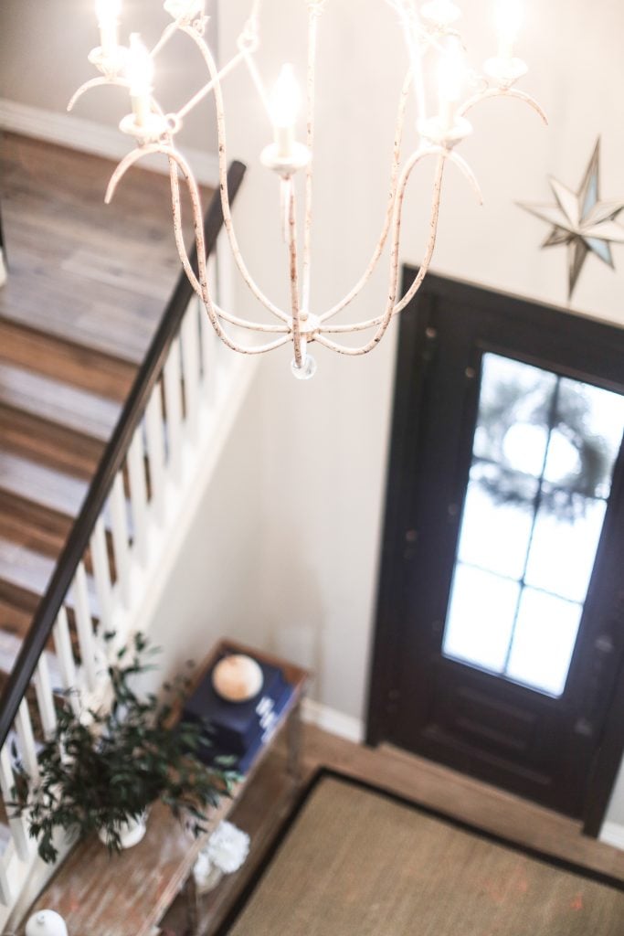 When you go to pick your chandelier or pendant for your entryway, scale is key! I referred to this article when hanging my own light in my foyer. Because I have a two story foyer my space could handle a large light. This one I picked up from Pottery Barn last year is SO perfect. Just delicate enough but still has some rustic details that adds texture and interest. Plus the shape fills up the empty space nicely. I also think a two or three tier light would do nice here, but I wanted something a little less bulky. I also love that it has enough light to actually light the entire foyer. Make sure when you are choosing a light that it has enough light bulbs to illuminate the space or put the lights on a dimmer for more light control.