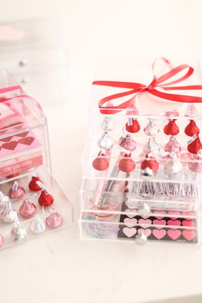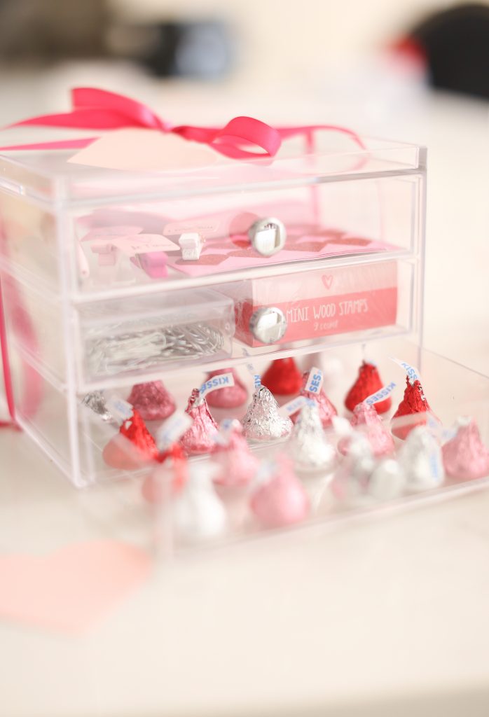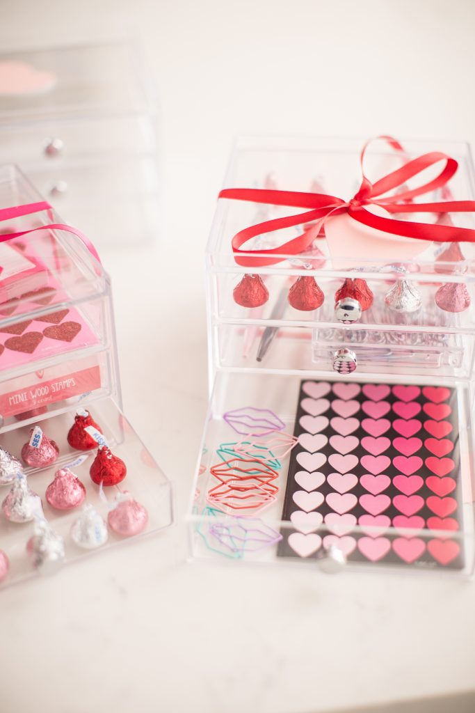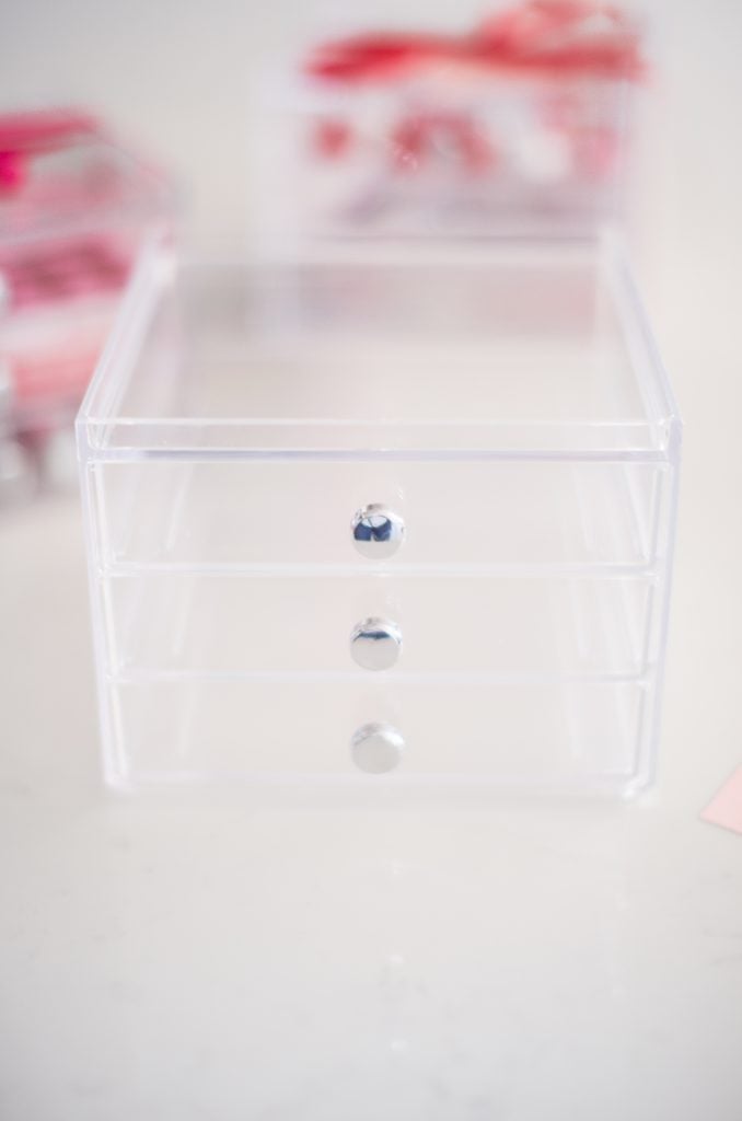 To start all you need is this cute clear acrylic box from InterDesign . It has three drawers that hold anything from chocolate treats to makeup brushes! The box is really a gift all itself because it can be used on their desk at school or at home in the bathroom! Plus it’s under $12 bucks! Of course with Amazon Prime you can get it to your home just in time!