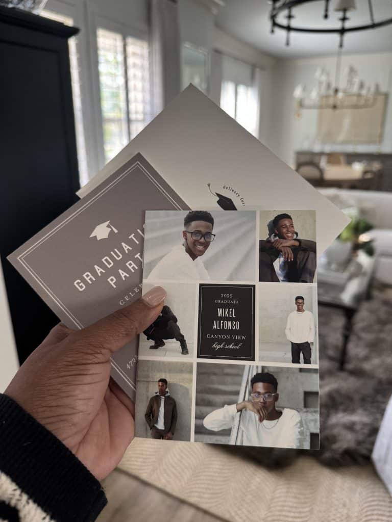 I picked the Distinguished design that reflected my son’s vibe—nothing too over-the-top, just clean, classic, and timeless. You can find all the graduation announcement selections on their website. I wanted an announcements that showed off as many of his senior pictures as possible haha! The quality is stunning, and I love that they offer matching thank-you cards and graduation party cards too.