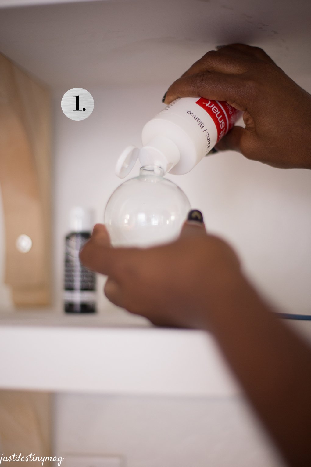 First take the top of the plastic ornament. After that take the white acrylic paint and add a generous amount around the inner edges of the ornament. I like to use a cheaper paint because it’s a little watered down so it allows the paint to move more. All the paint to drip down to the bottom.
