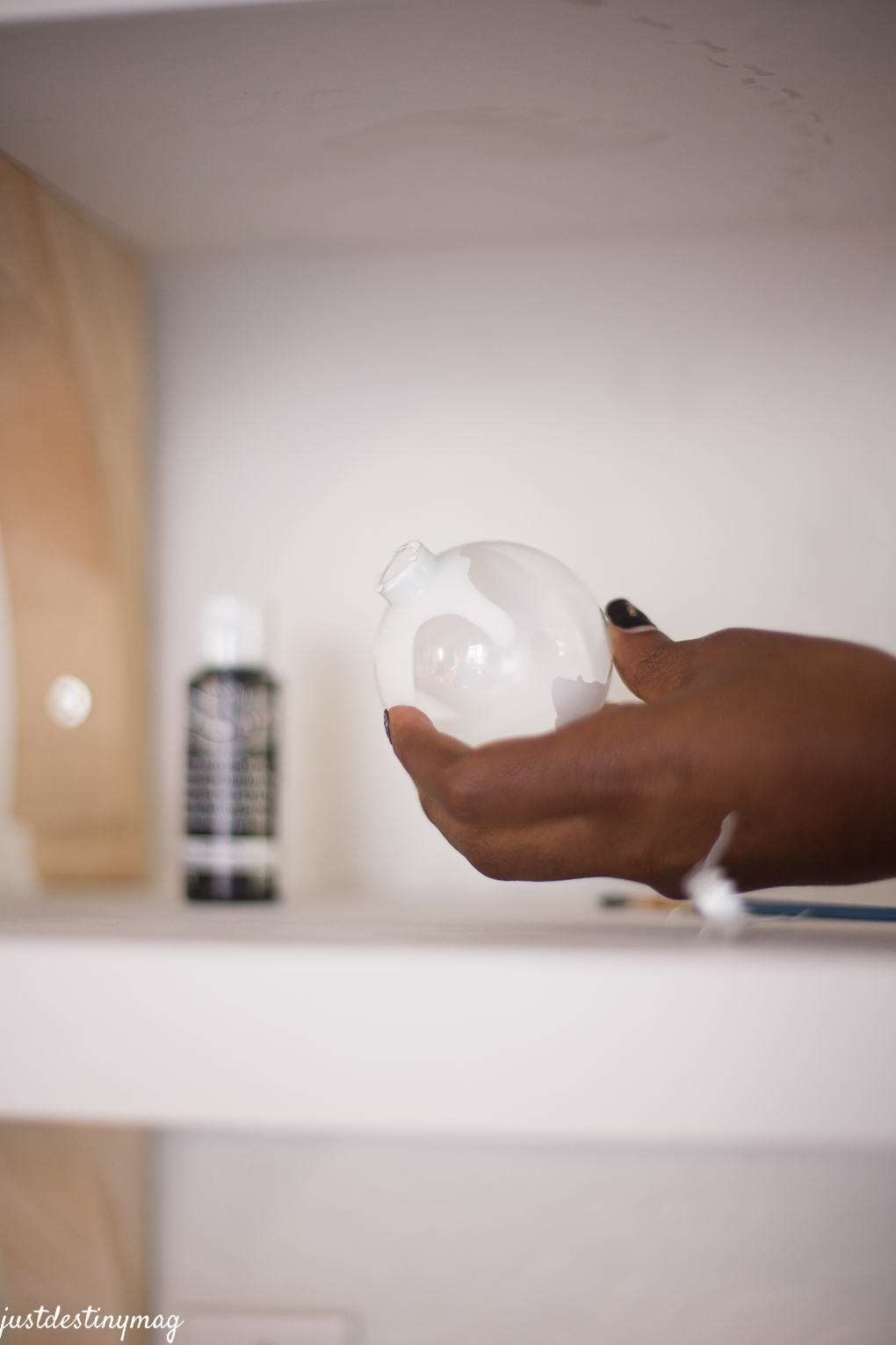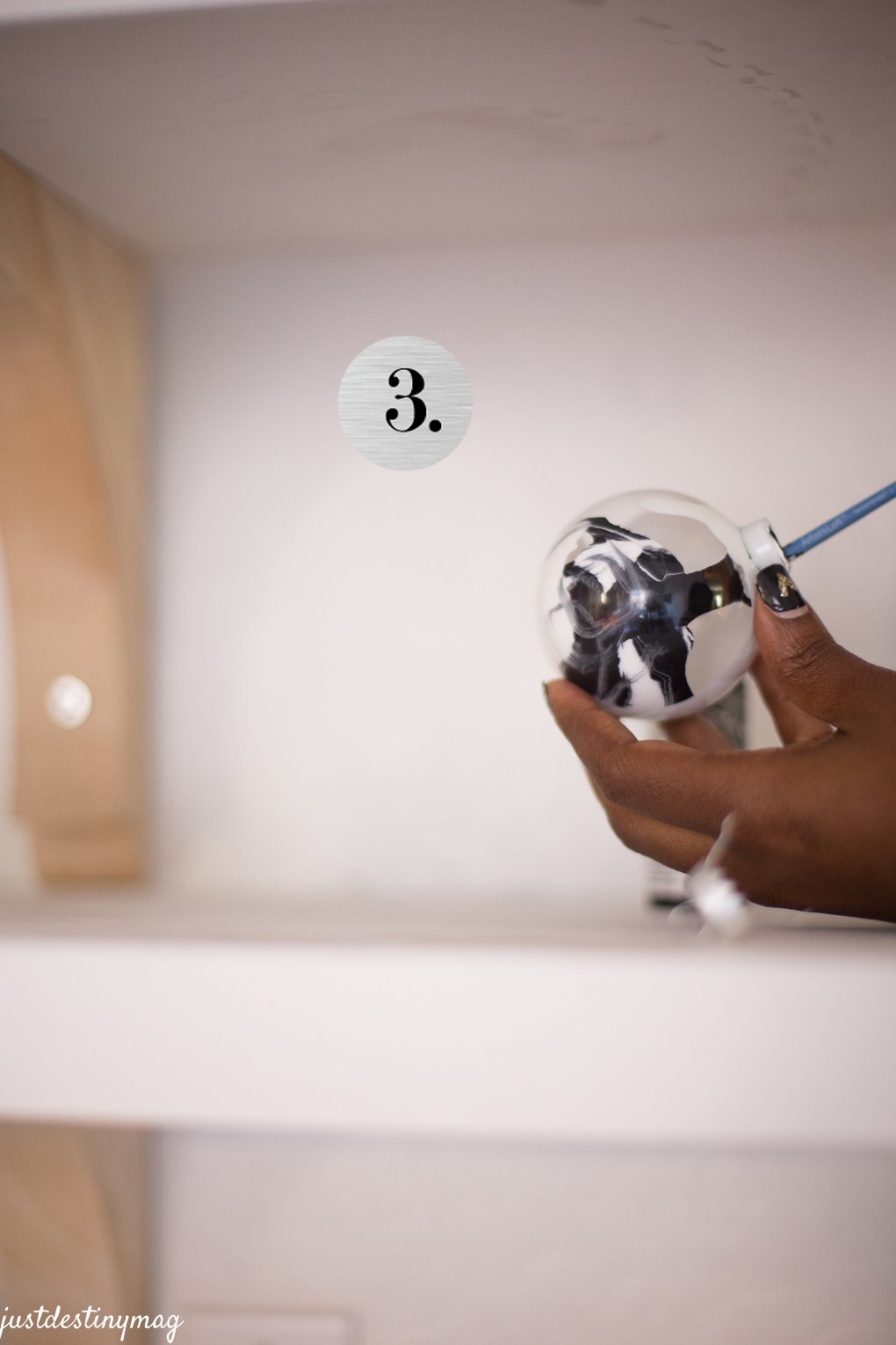 Next take your paint brush and gently add some movement to the ornament. if your seeing some spots that need to be filled move the paint towards those spots. Just make sure not to mix the paint, just small soft strokes to keep the marble look.
