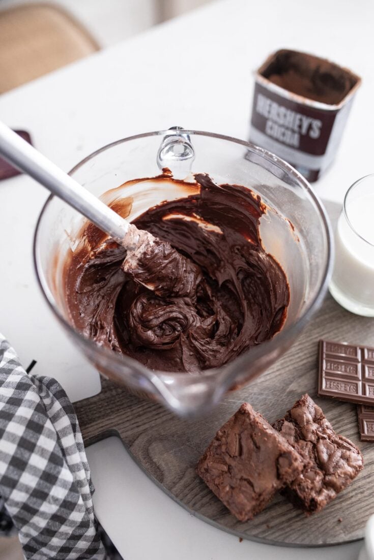 While the brownies are baking you can start to make the HERSHEY’S Perfectly Chocolate frosting. This recipe is the perfect way to attach a little HERSHEY’S pip onto the brownies after they have cooled. To start, you’ll need HERSHEY’S Cocoa powder along with soft butter, powdered sugar, milk and vanilla. You can see the full recipe below!