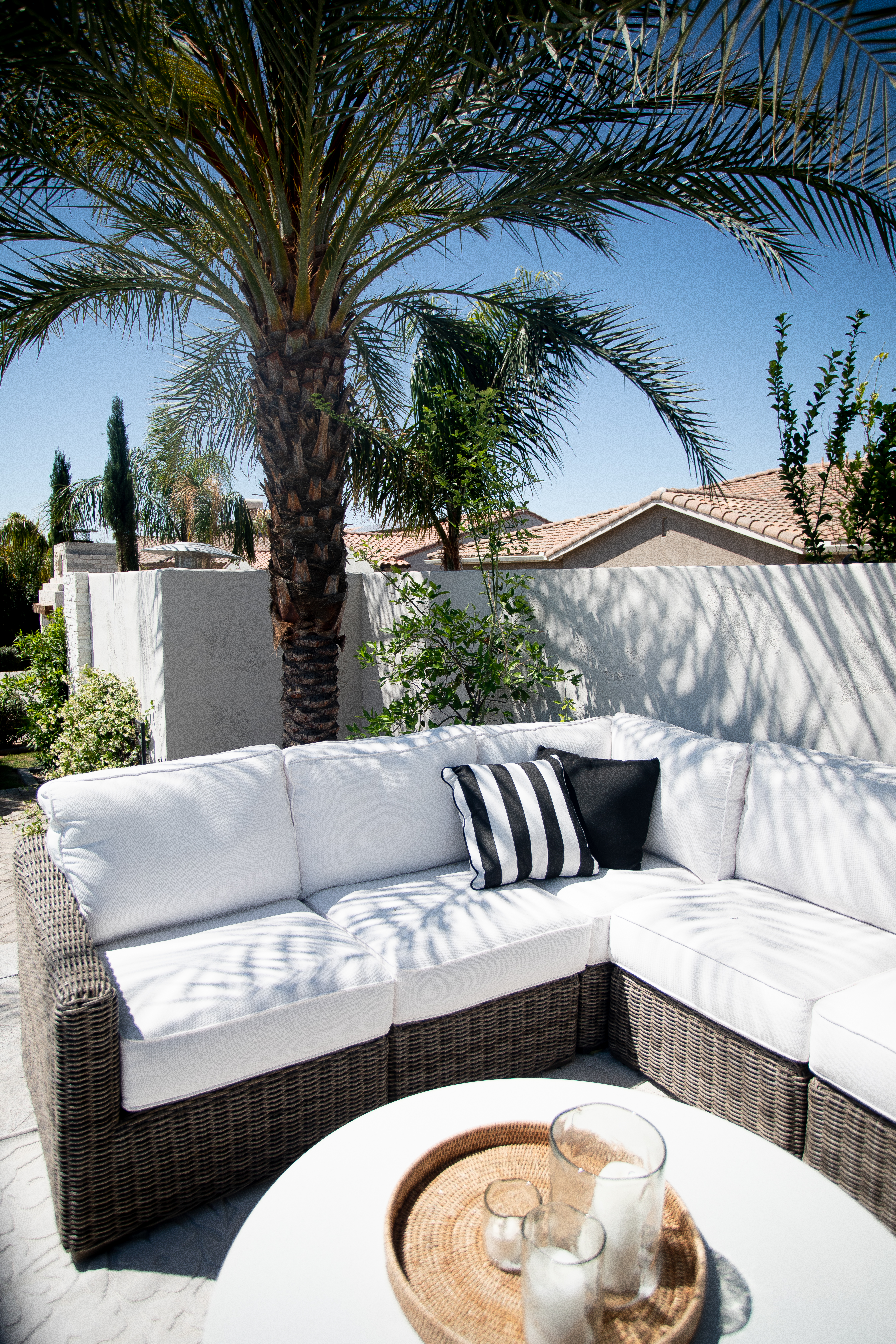 Inside and outdoor spaces can stay related by choosing similar color schemes. In our outdoor space we used a classic black and white color scheme that is very versatile and really complements all the natural trees, palms and foliage we have in our yard. Black and white are two colors you will also find inside our home as well. So when you step out into our yard it just feels like an extension of our home.