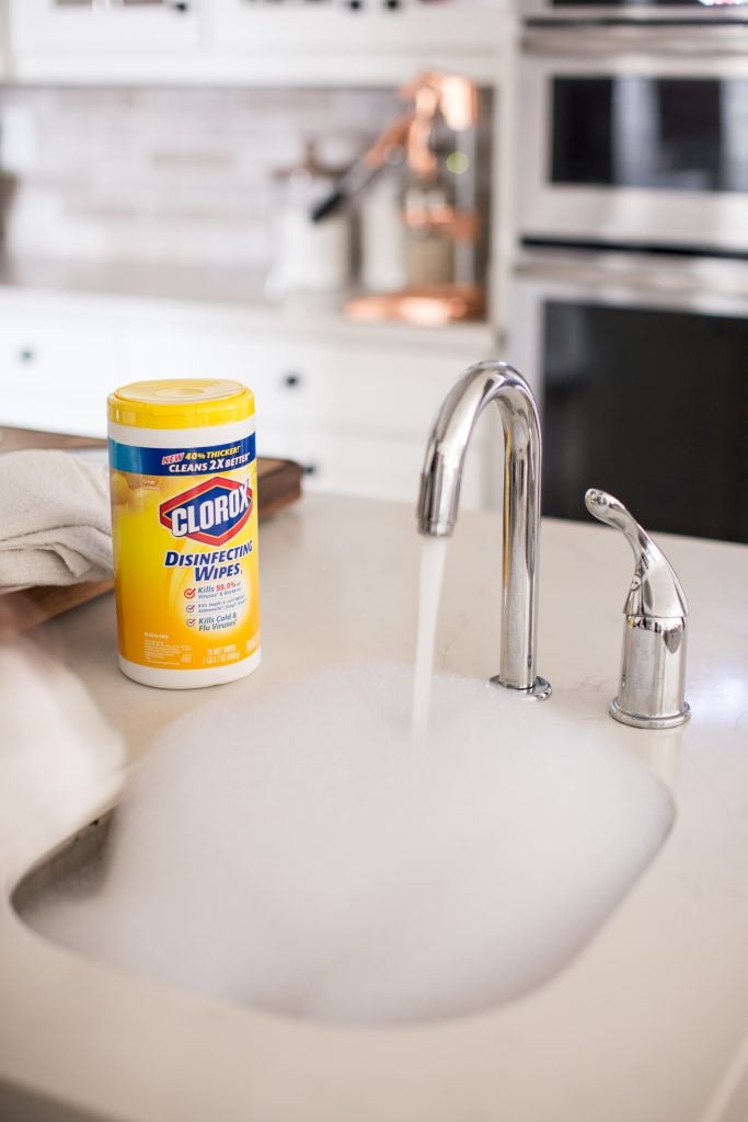 If you’re cleaning and disinfecting your kitchen, make your way over to the faucet, fridge and oven handles and give them a little wipe down too. As I’m cleaning I just go over everything that is touched on a daily basis with a Clorox Disinfecting Wipe!
