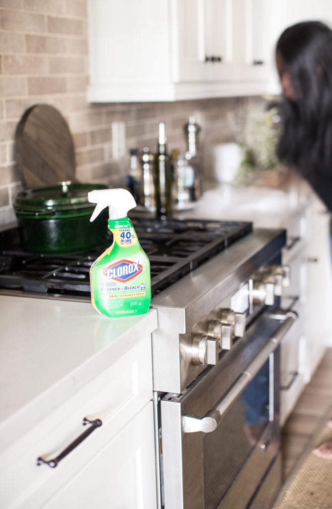 Clorox all purpose cleaner with bleach also works great to remove any odors in the bathroom and kitchen after a cold or flu as well! You must always handle anything with bleach very carefully so I alway spray and remove myself and kids from the area immediately so I let the bleach work and do it’s job. I also open up windows, let the solution sit for a bit and then come back to wipe everything down!