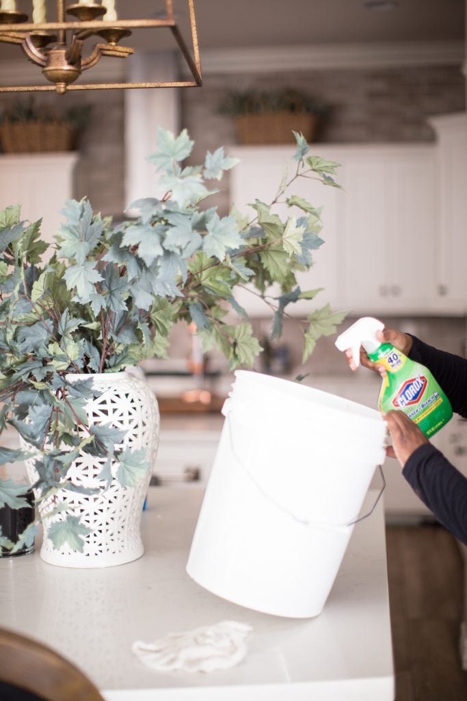 To disinfect the buckets and pails I like to spray a good amount of Clorox all purpose with bleach cleaner and let it sit for about 30 minutes.