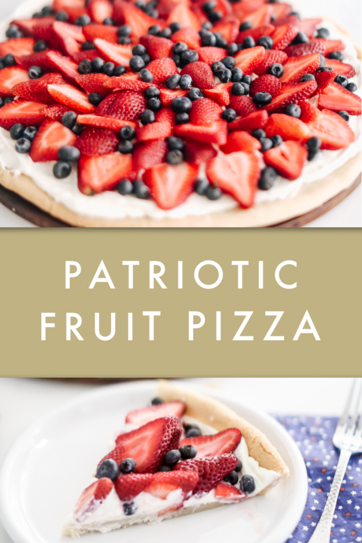 A patriotic dessert perfect for Memorial Day and Fourth of July. This delicious Red, White and Blue Fruit Pizza Recipe is topped with fresh fruit on top of a yummy sugar cookie crust.