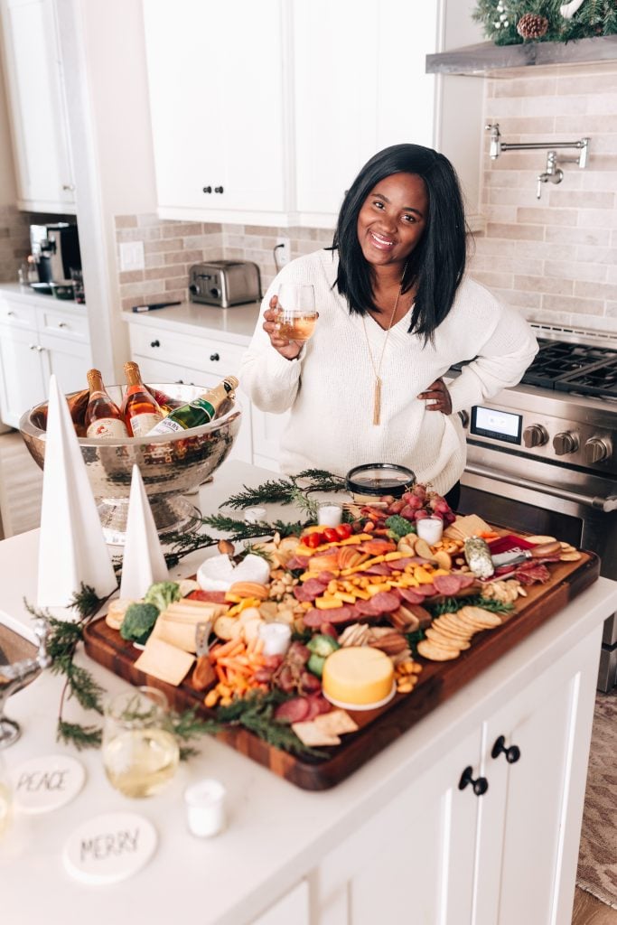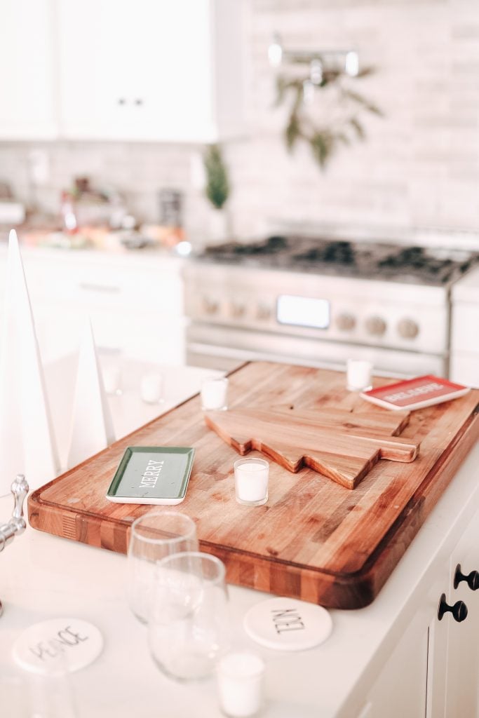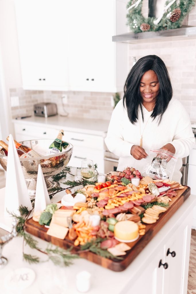 Next decide how you want to arrange and go for it. This board was set up for the holidays so I put a cute little Christmas tree cutting board in the middle along with some plates to hold cheeses. I like adding small plates and risers so that it gives the board some depth.