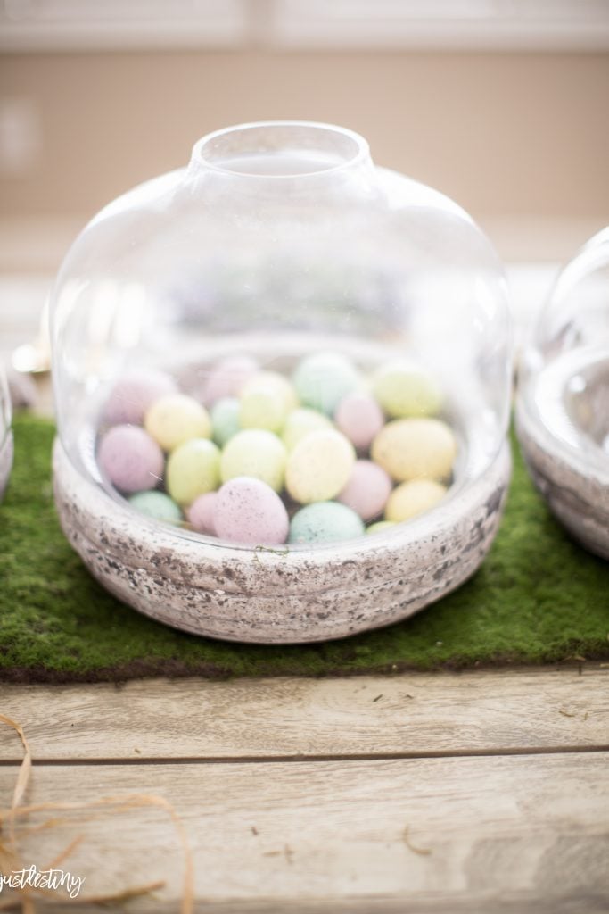 Gorgeous centerpiece using a terrarium, florals and faux easter eggs. Beautiful center piece for your Easter or spring table.