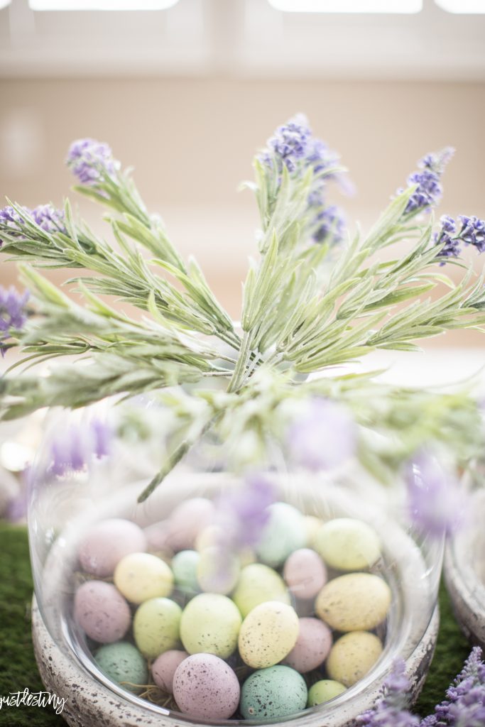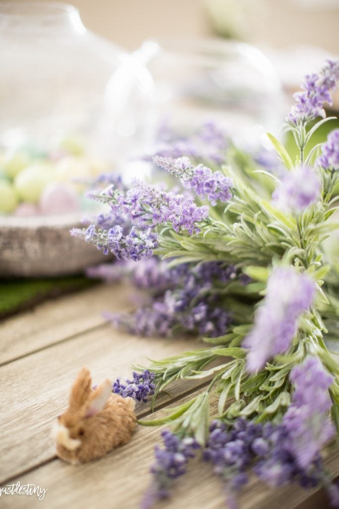 - Then use floral stems to fill the tops of the centerpiece. We used gorgeous lavender stems for a soft look! Perfect for Easter.