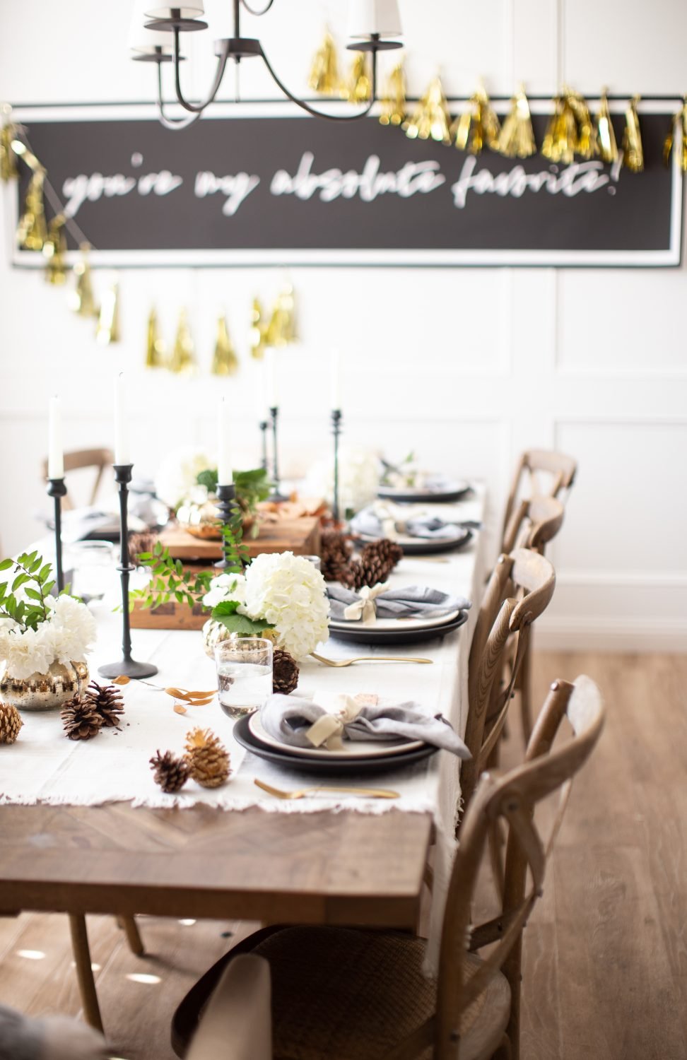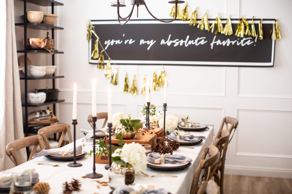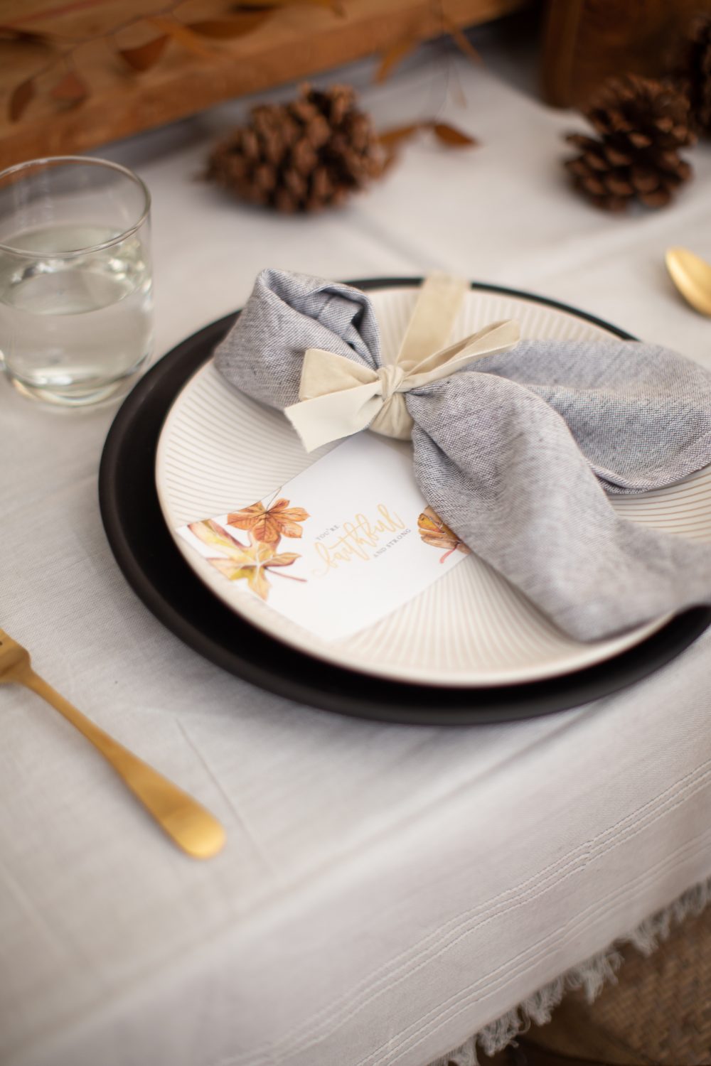 Each table setting is stacked with a black charger, textured plate and a word of affirmation print. I made to let each person know how much they mean to me. To make it even more personal you can write a small note on the back and they can take it home as a keepsake!