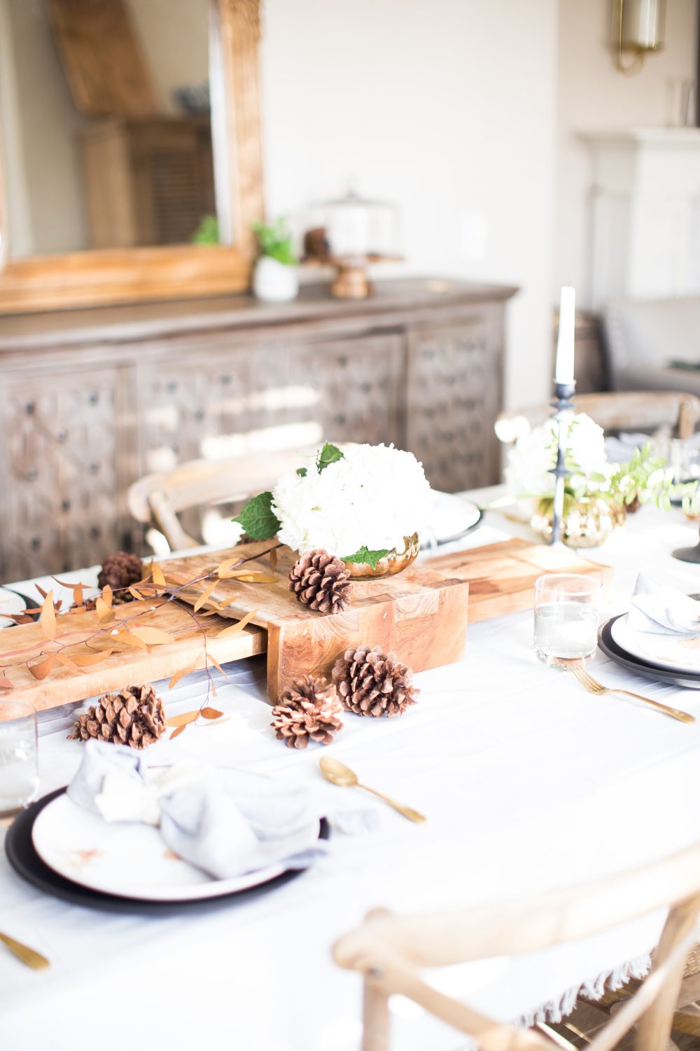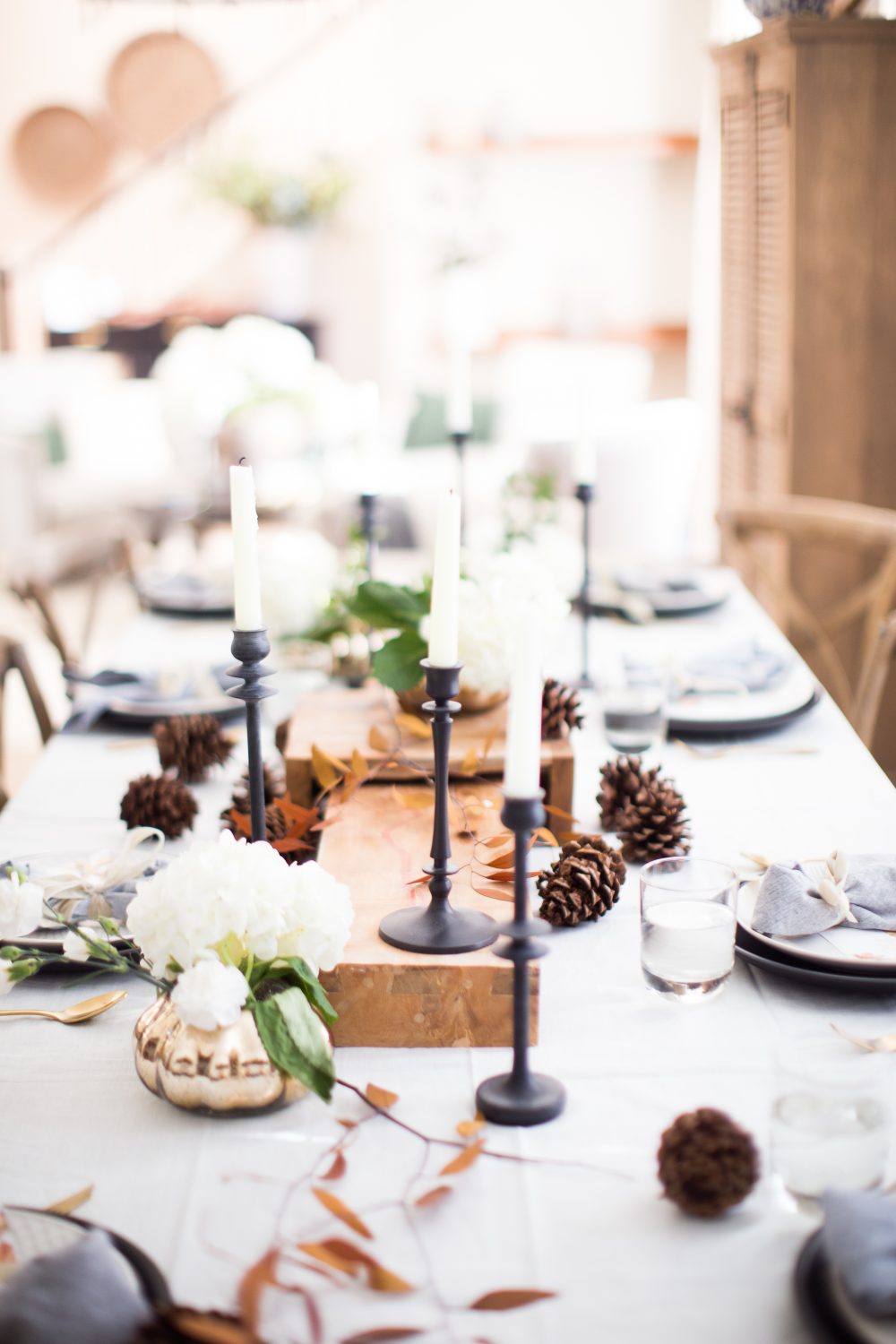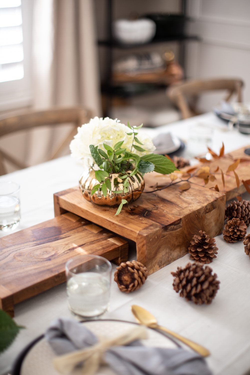 Down the middle I lit tapered candles in black candlesticks along with a small arrangement of flowers in pumpkin vases. I love to use different heights when I set the table and keep visibility across the table. I also brought in fall colors using warm wooden risers and pinecones scattered throughout the table.