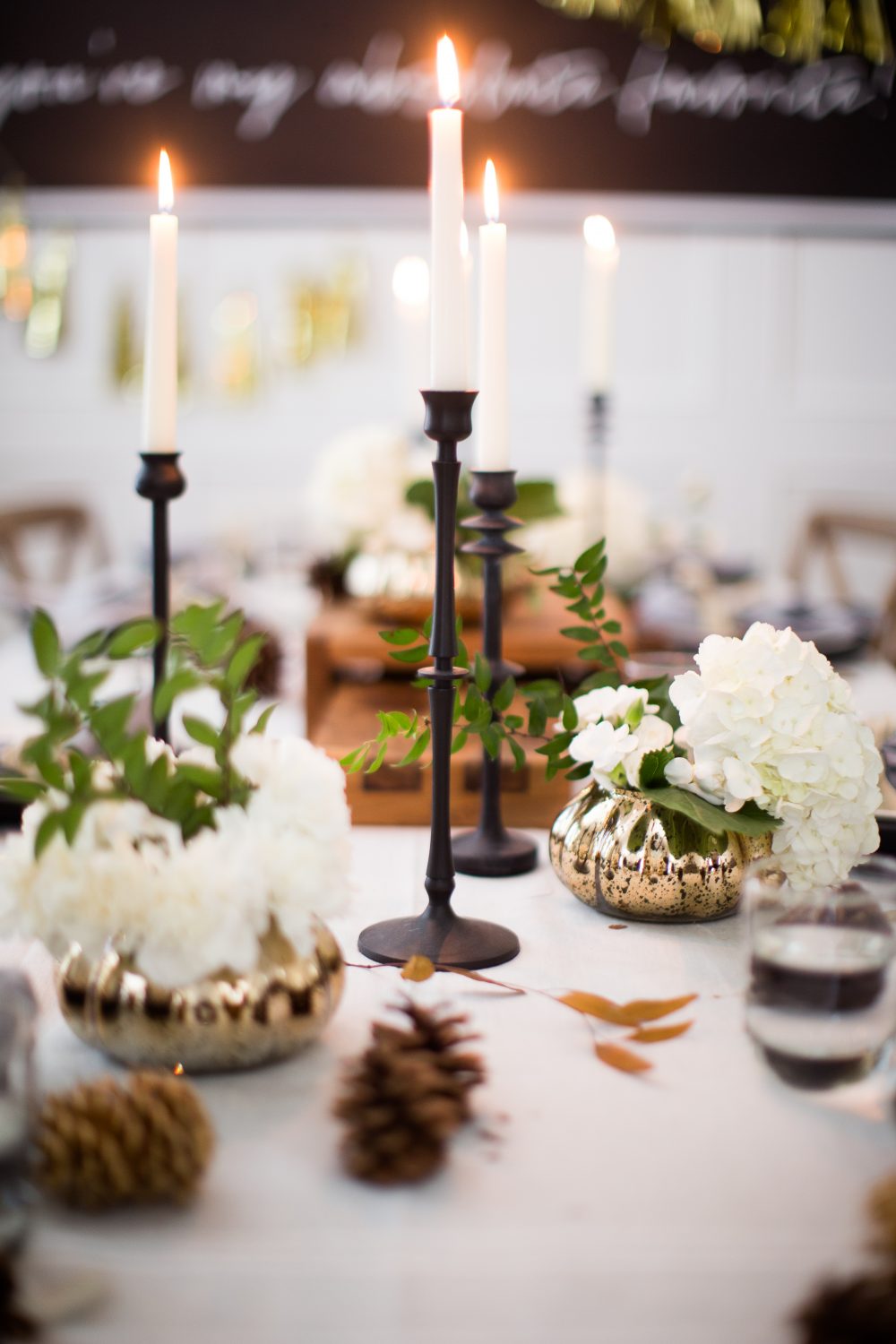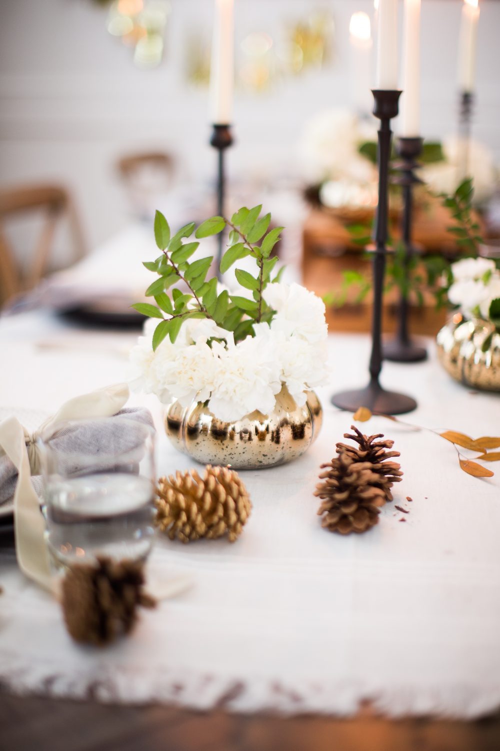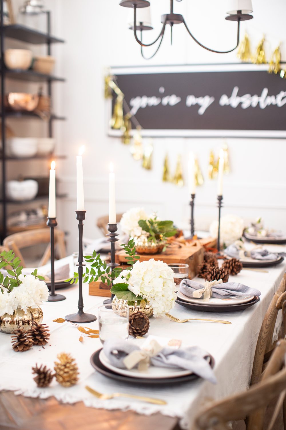 Down the middle I lit tapered candles in black candlesticks along with a small arrangement of flowers in pumpkin vases. I love to use different heights when I set the table and keep visibility across the table. I also brought in fall colors using warm wooden risers and pinecones scattered throughout the table.