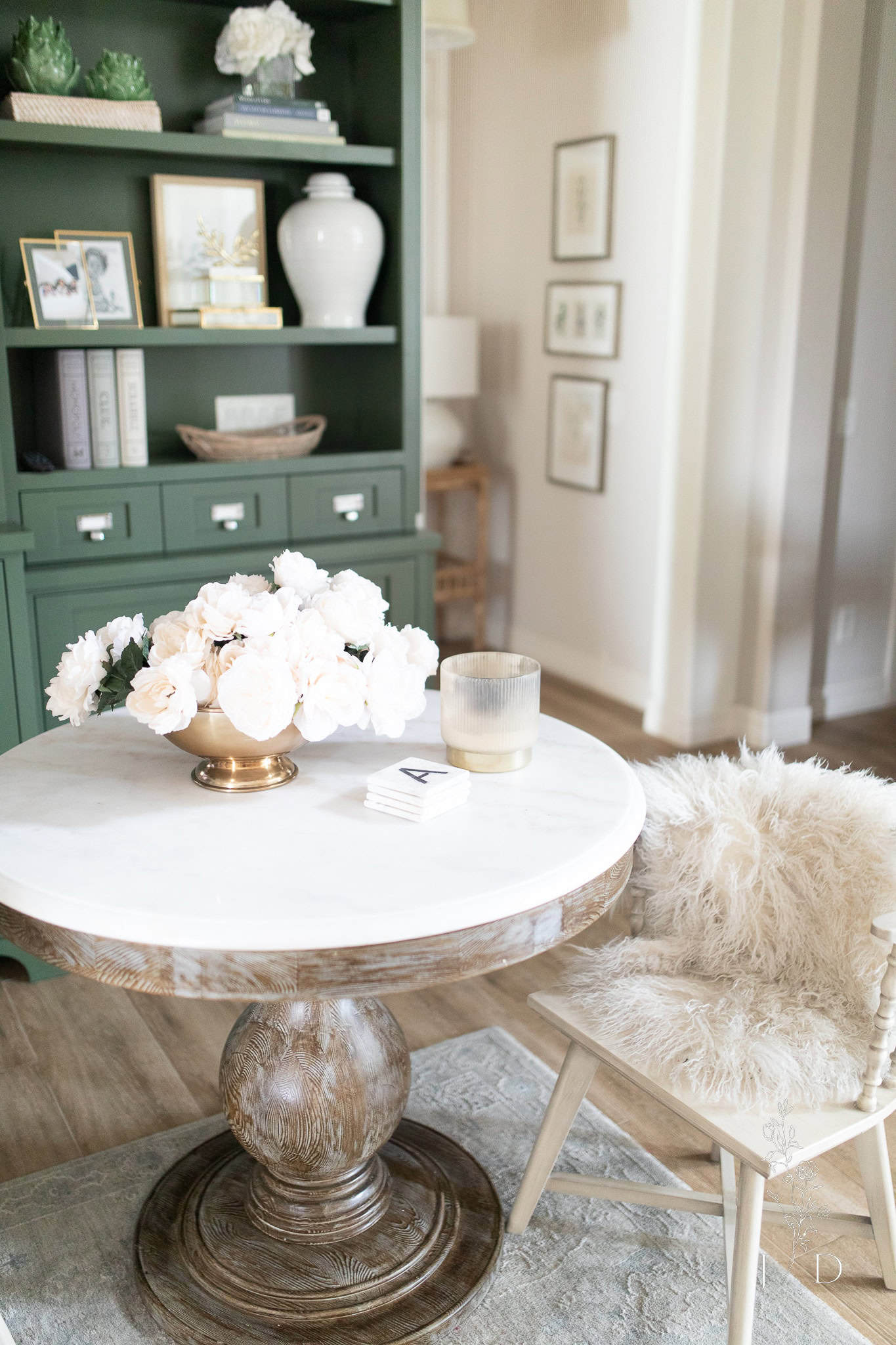 I also love using warmer winter whites around the house too. These faux roses in a brass pedestal is a perfect transition after Christmas.