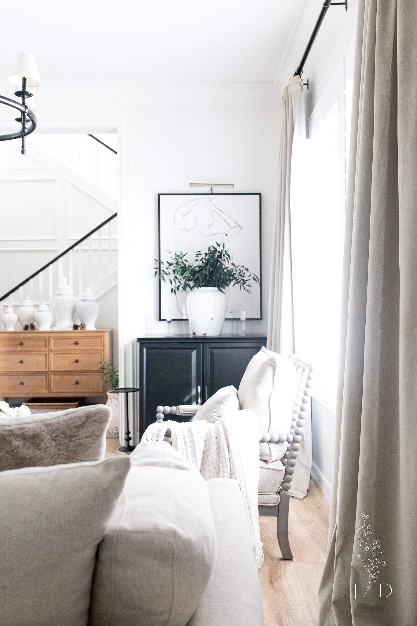 In our living room I filled this beautiful vase up with simple greenery. The dark green stems are perfect for keeping the space grounded.