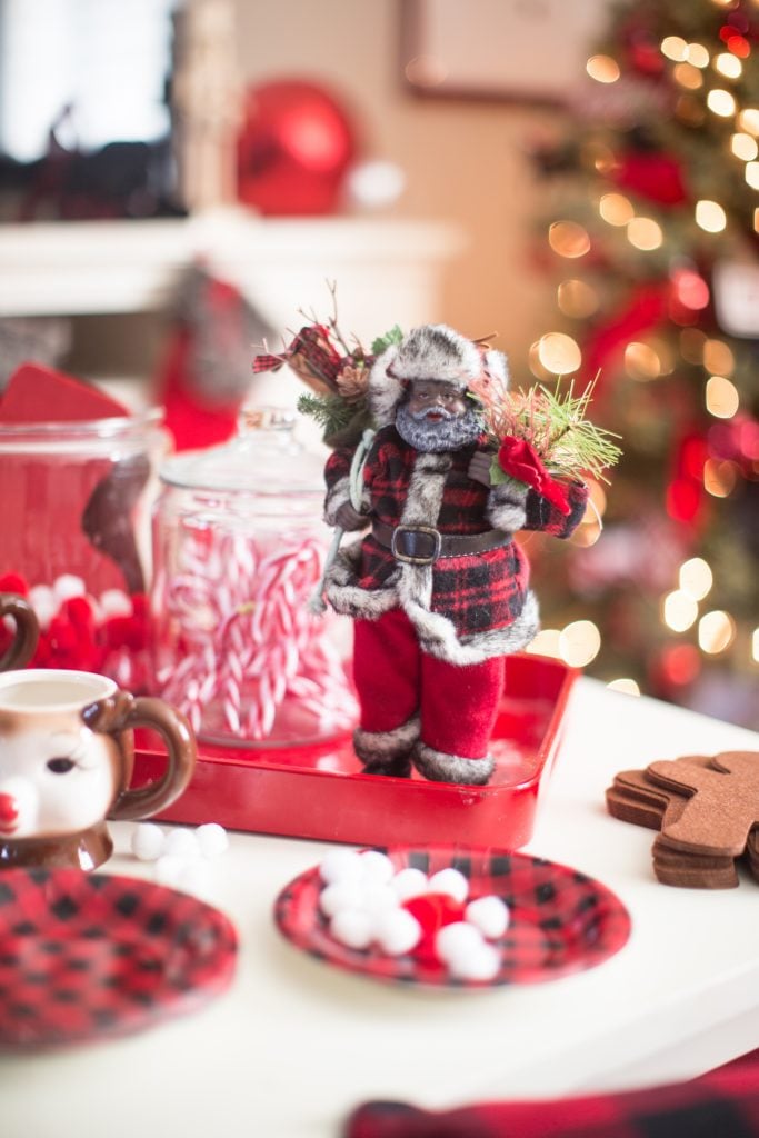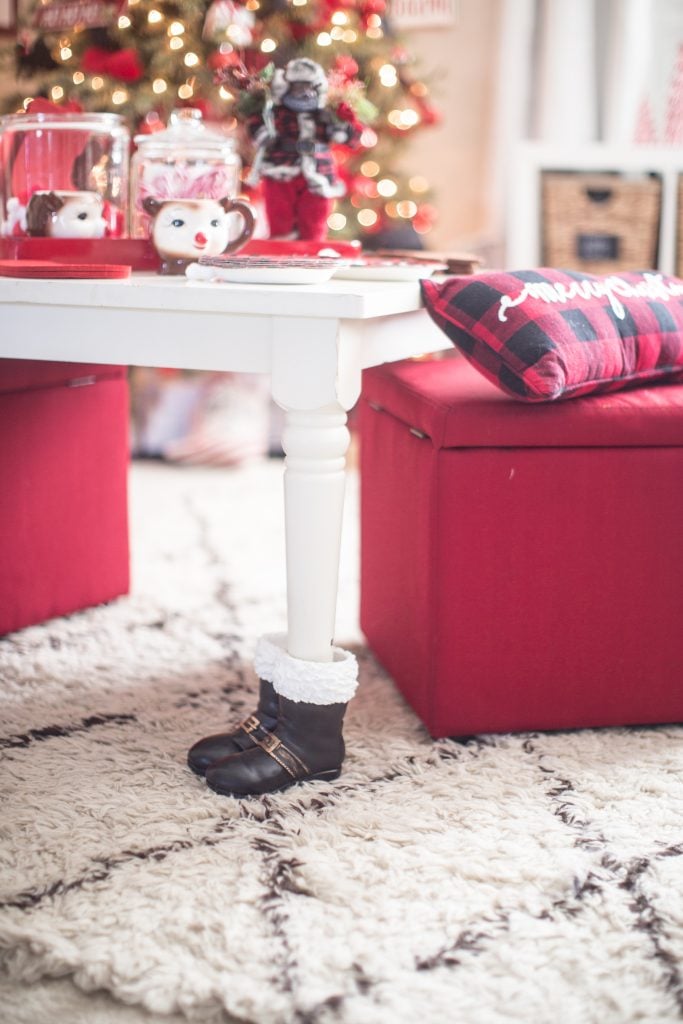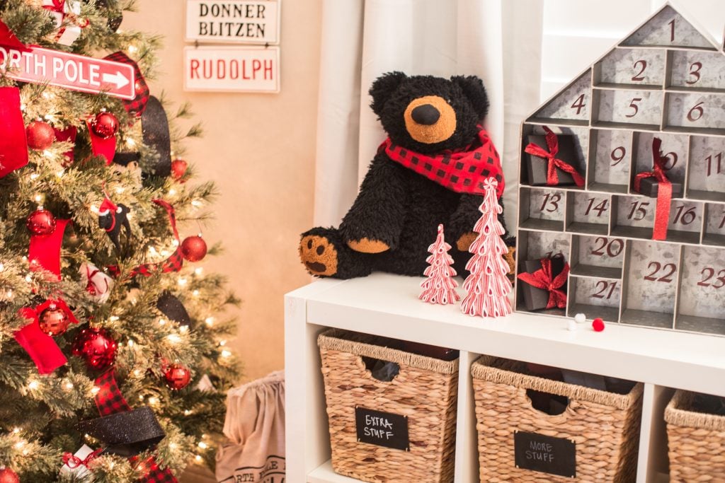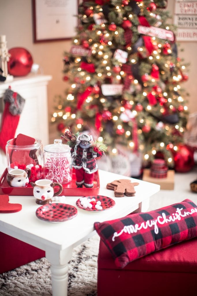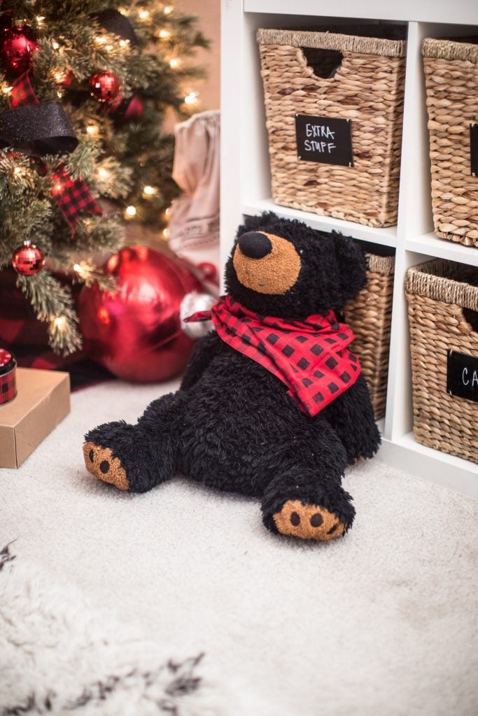 Under the tree I have a buffalo check tree skirt that coordinates with some of the items in the room.