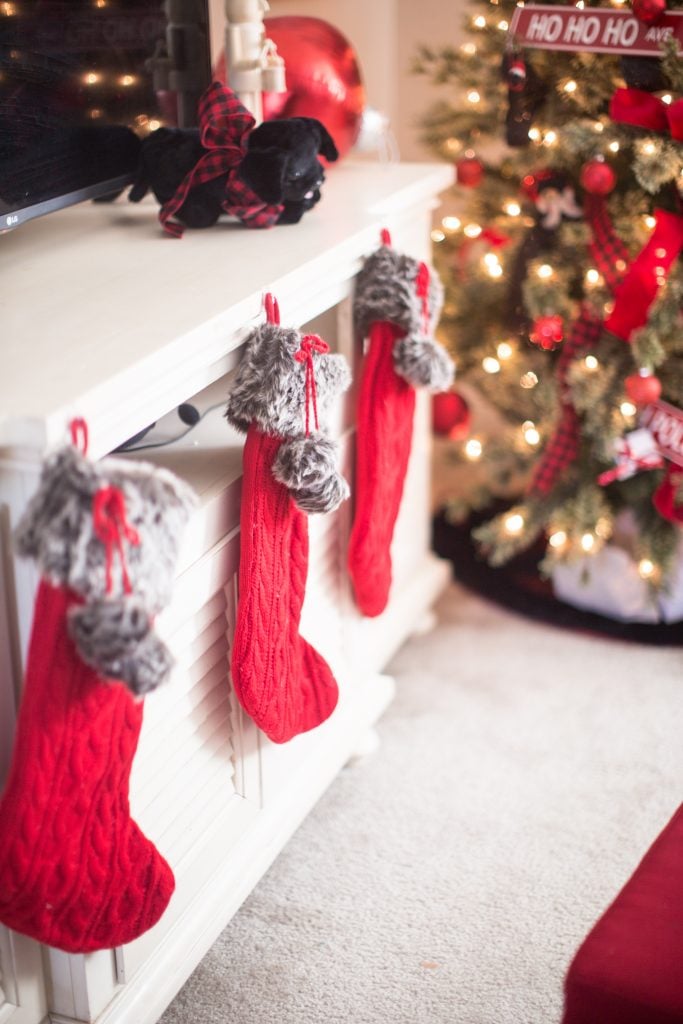 Because the kids don’t have a fireplace or mantel upstairs I hung stockings on the tv console using command hooks!