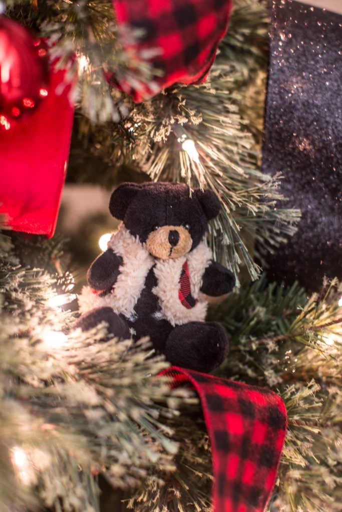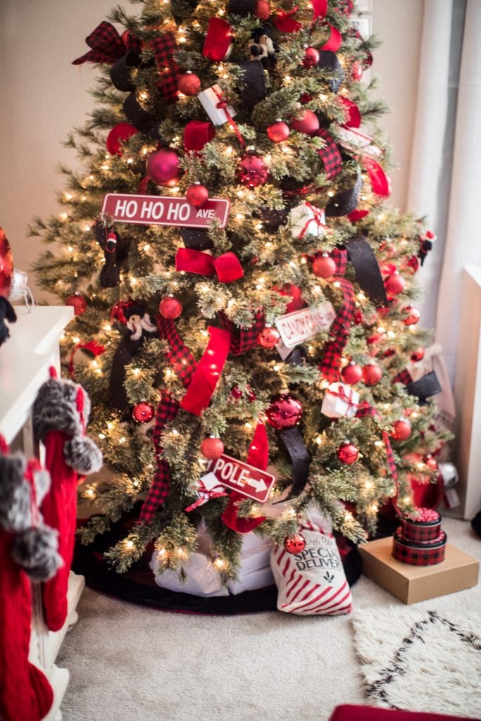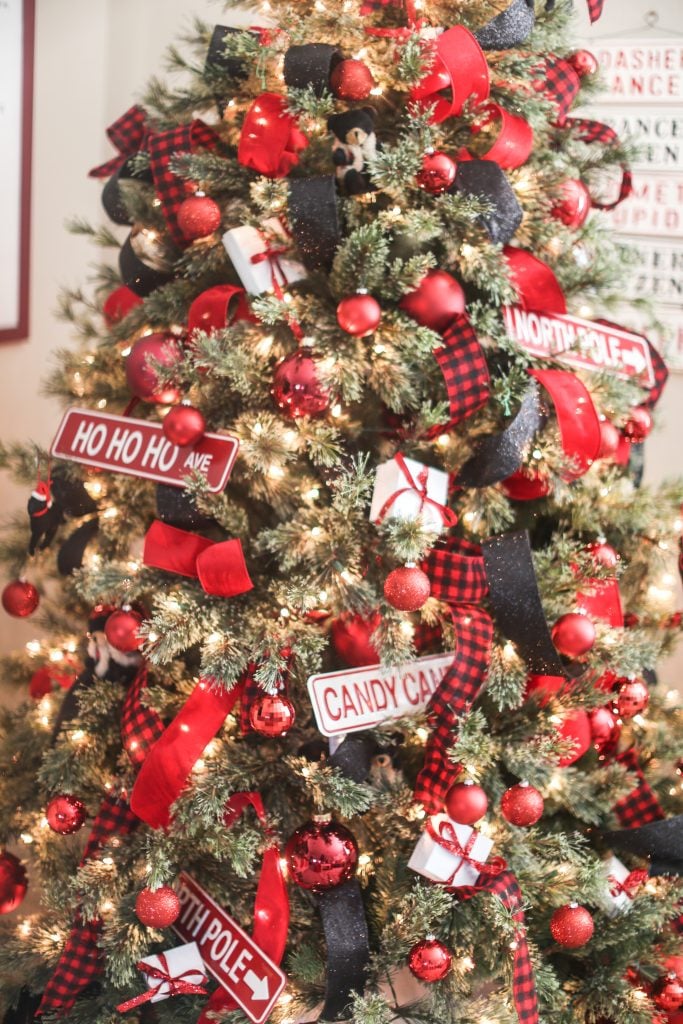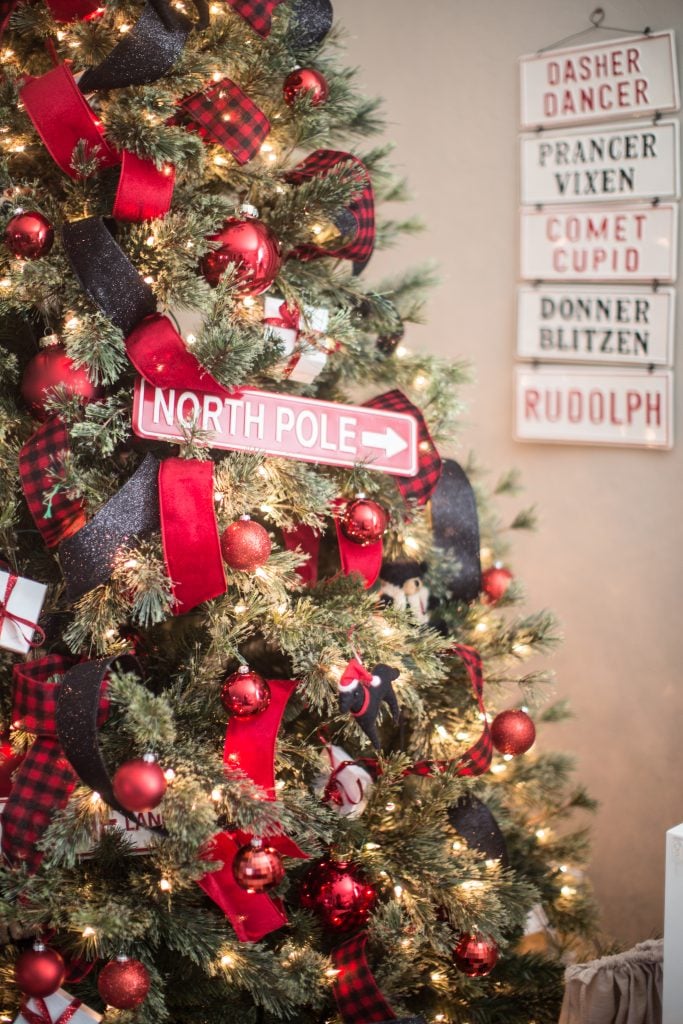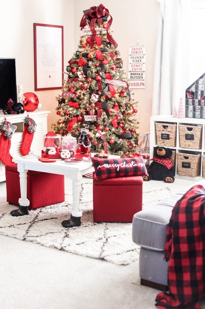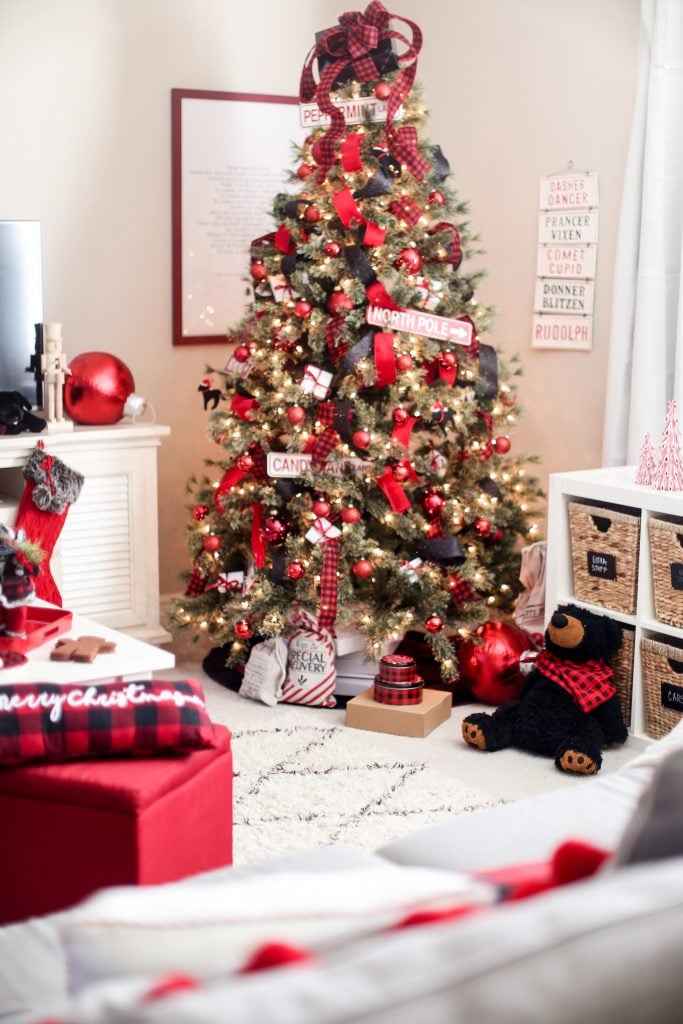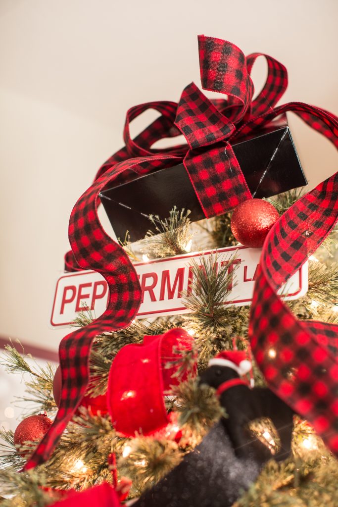 I started off with this classic buffalo check pattern in red and black. I thought it was a perfect starting point for the cabin feeling. I also used this pattern for this Christmas tree but I think this gives the look a more playful feel that fits this room more. I weaved festive ribbon in and out of the tree using a fun black glitter, velvet red and or course buffalo check which you can find at Michaels!