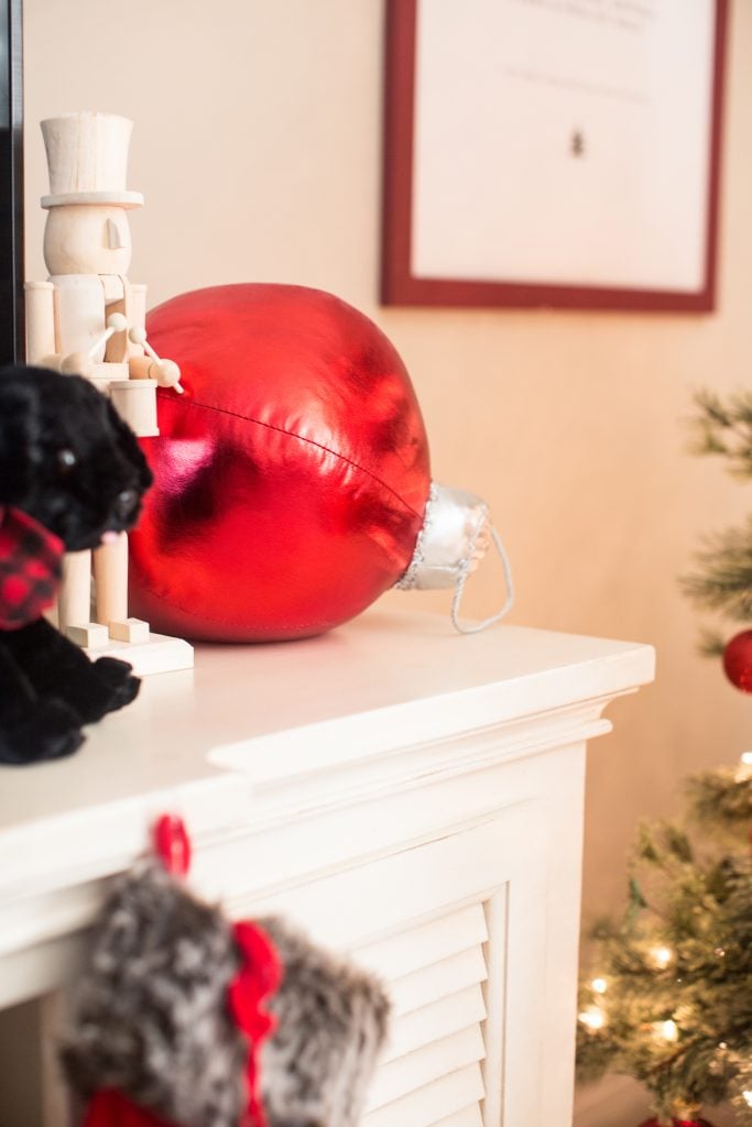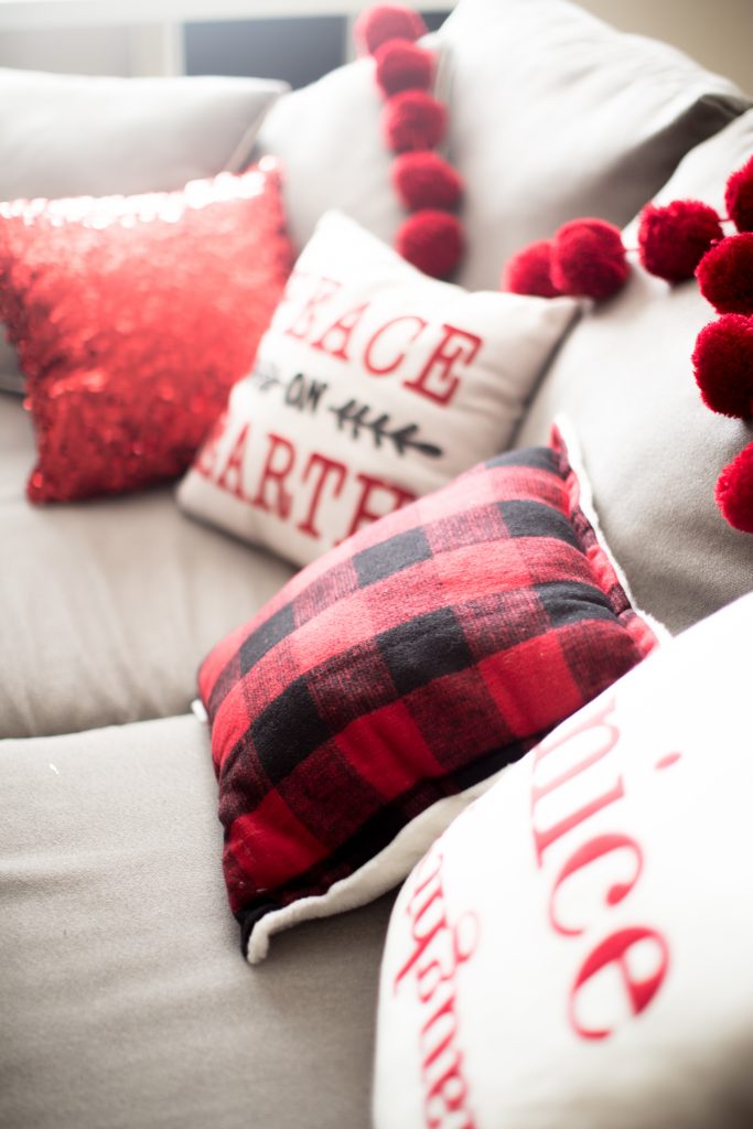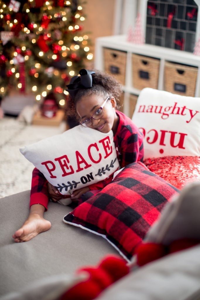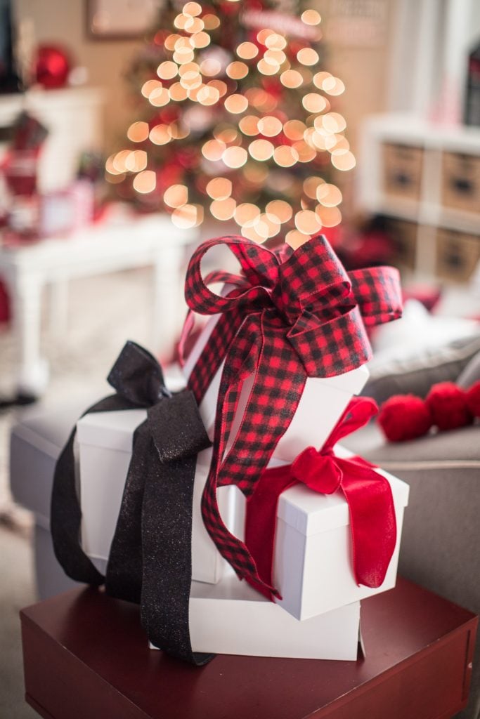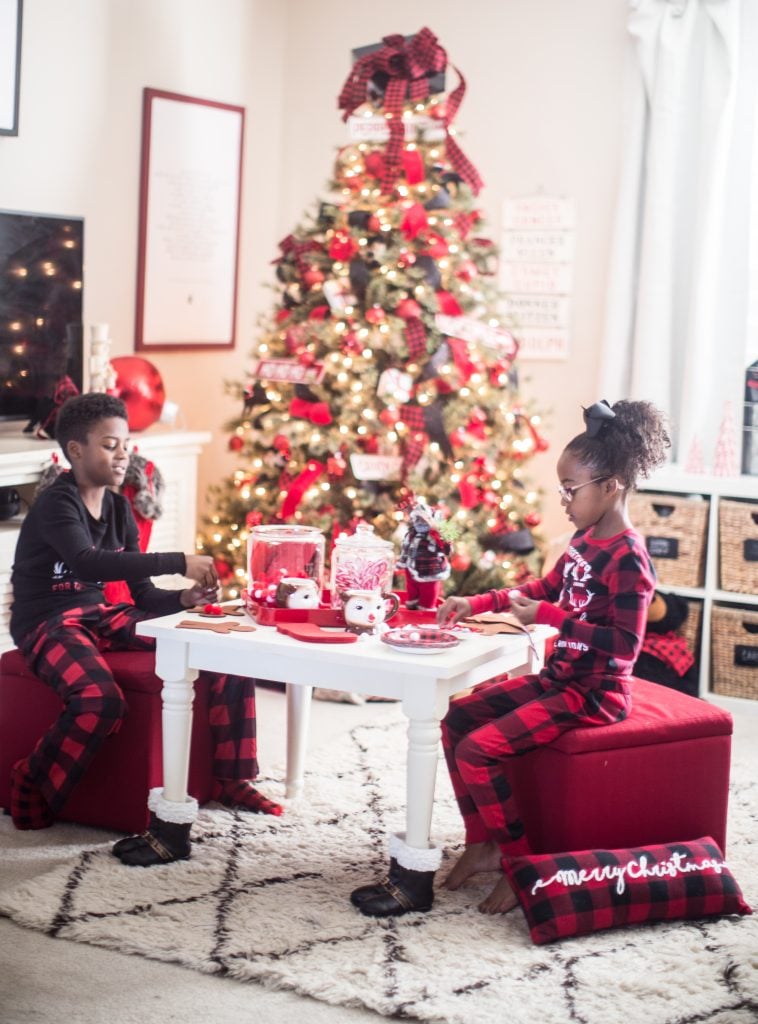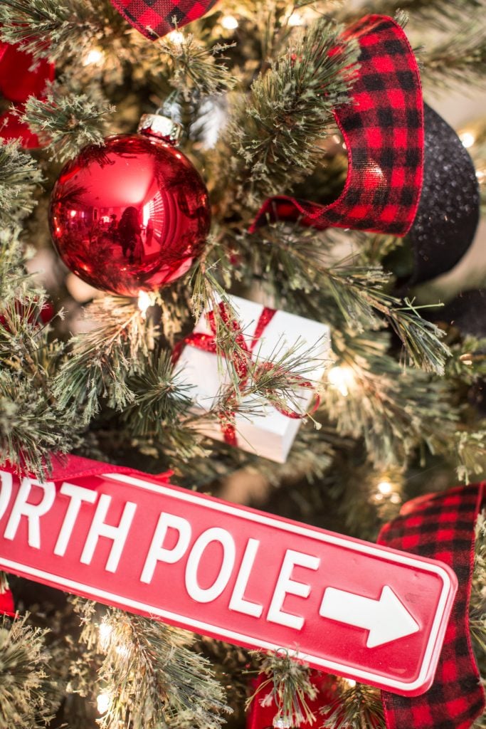 I started off with this classic buffalo check pattern in red and black. I thought it was a perfect starting point for the cabin feeling. I also used this pattern for this Christmas tree but I think this gives the look a more playful feel that fits this room more. I weaved festive ribbon in and out of the tree using a fun black glitter, velvet red and or course buffalo check which you can find at Michaels!
