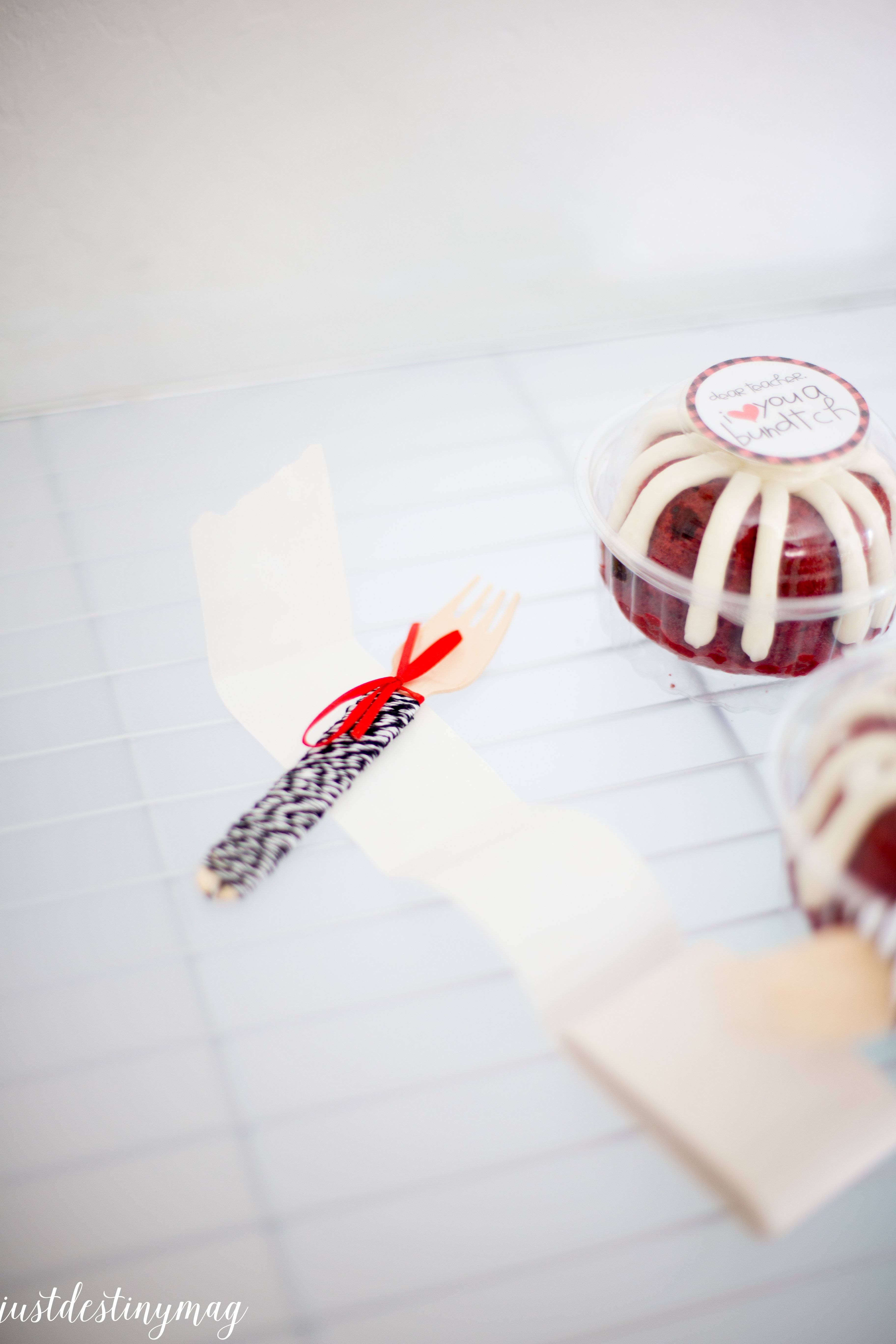 2. Glue the printable on top of the bundtlets container ( comes with the cake ) with a glue dot or hot glue.