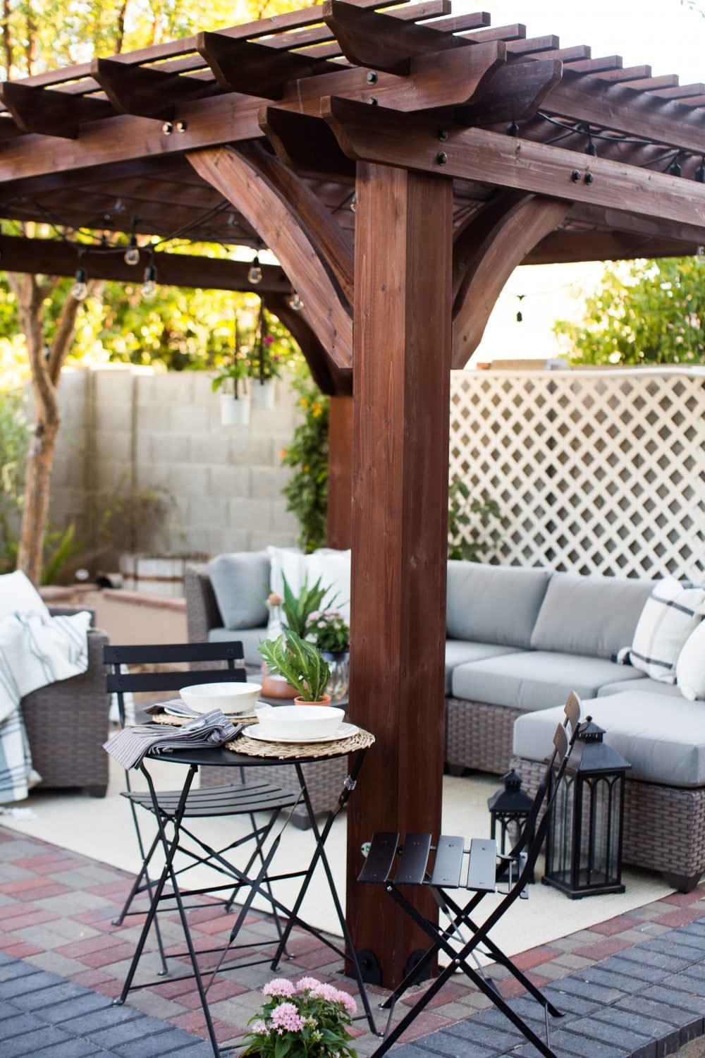 The interior of the pergola is about 10ft x 10ft which leaves more than enough room for a seating area like this one or even a dining area! In other words, it really just depends on what your needs are.