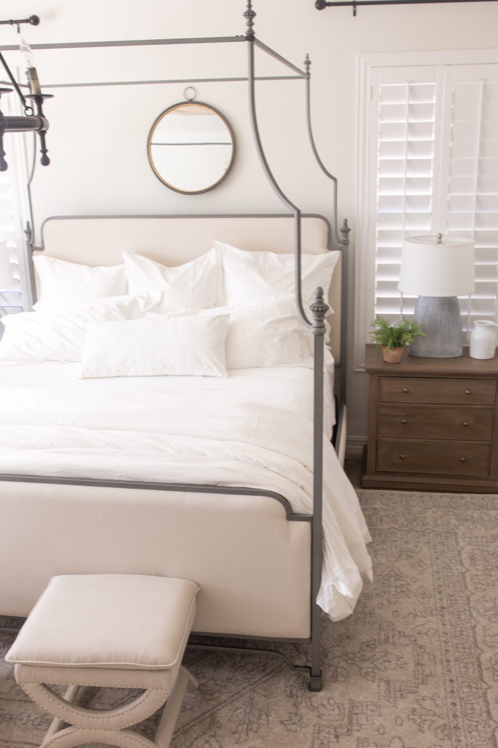 The centerpiece to this entire room is this gorgeous metal canopy bed . Scrolling through the Home Depot website you can find a ton of different bed options from Home Depot’s private brands like Home Decorators Collection and StyleWell. But this bed stopped me in my tracks. Elegant lines and finish with the most beautiful upholstered headboard , side rails and footboard.