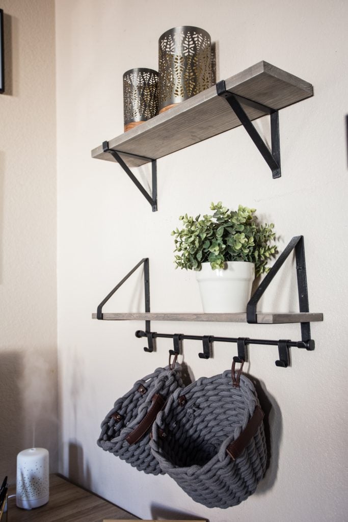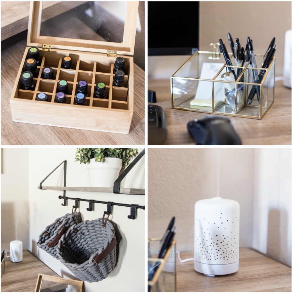 On her desk I added a collection of essential oils with an organizer ( you can find this in-store) and a diffuser. My hope is that a few oil combinations will help her stay focused, energized and relaxed throughout the day as she’s on calls and on the computer. We also used a bathroom vanity organizer for her office supplies! The knitted baskets that hang from the shelf/ hook combo that I picked up will definitely help her stay organized as well!