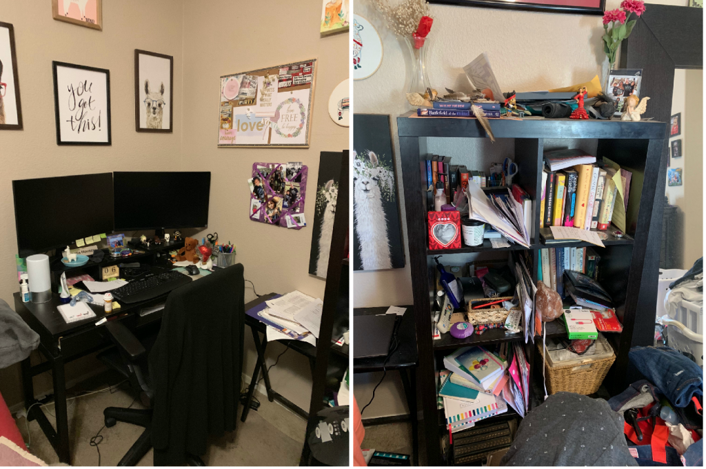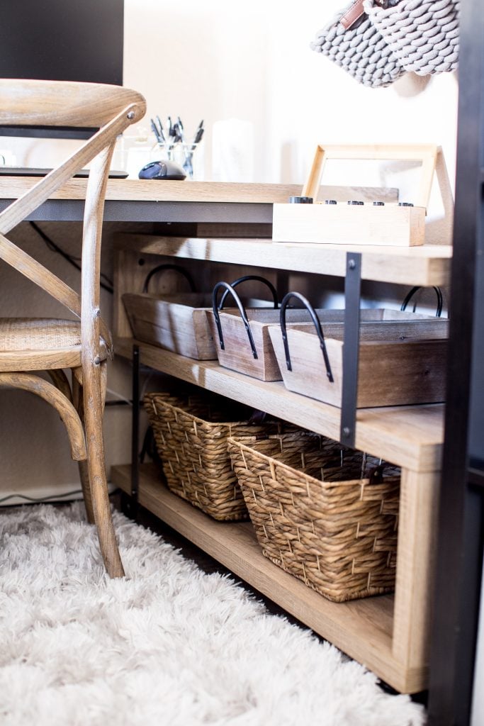 Venetia decided to use the corner of her bedroom as an office space. I thought is was such a great idea and something that anyone who works from home can do! If you don’t have an extra room or you really just want the convenience, a corner office in the bedroom is great! Just like all of us, she needed a few organizational pieces to help with her desk and bookcase. She also needed a more functional desk that fit into the corner along with some baskets and bins to help!