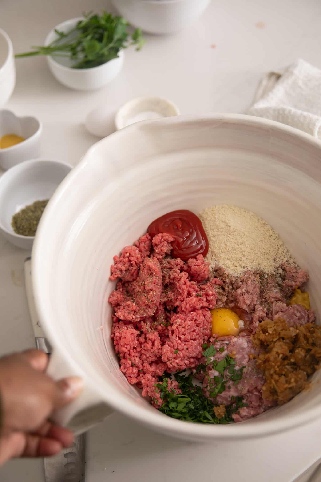 To add flavor to the meatloaf, you’ll need a variety of herbs and spices. A classic combination includes garlic, onions, thyme, and parsley. I used Italian seasoning along with fresh parsley.