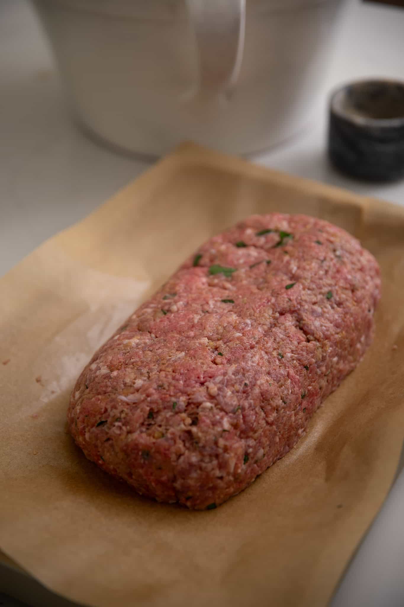 - Once the mixture is well combined, turn out the meat mixture onto a baking sheet covered with parchment paper or foil and form into slightly oval loaf. You can also divide it into 4 equal mini-loaves.