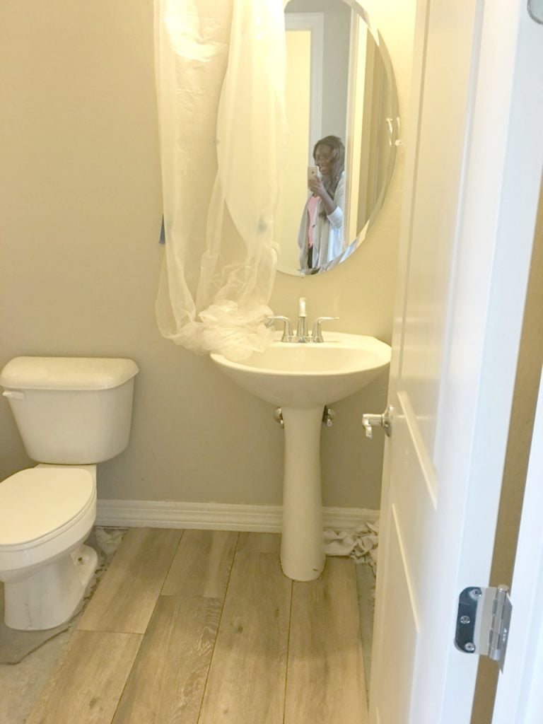 So back to this bathroom makeover. You guys remember in this post I explained what the plan might be. If you take a look at the before you can see it’s is just your typical builder grade powder room. Nothing special. Painted walls, pedestal sink and a working toilet!