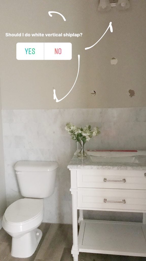 Well I decided on the white vertical shiplap and here is why. I thought for sure the black would’ve been my choice but because we split the wall with the marble, the contrast of it all would have been too much. So I decided to give the transition some cohesiveness by just leaving it white and taking the shiplap UP instead of across to help accentuate our taller ceilings. Then accent it with the black that I love SO much.