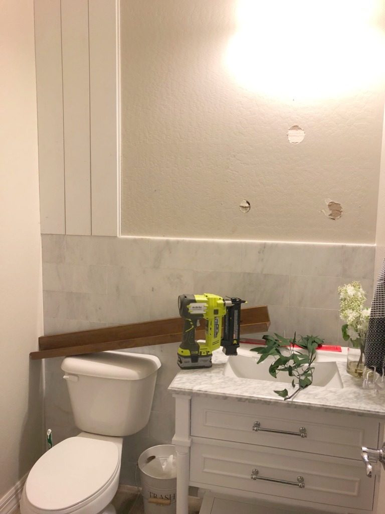 So we started off by getting rid of the sink, and mirror and doing a half wall of marble tile. I initially decided on a smaller tile BUT I really wanted to see more of the marbling so I decided on these slightly larger Carrara Milano Polished Marble in a 6×18 with a bright white grout for better blending. I wanted it to mimic just one large piece for marble. The install was done in a traditional staggered layout with 1/4 spacers.