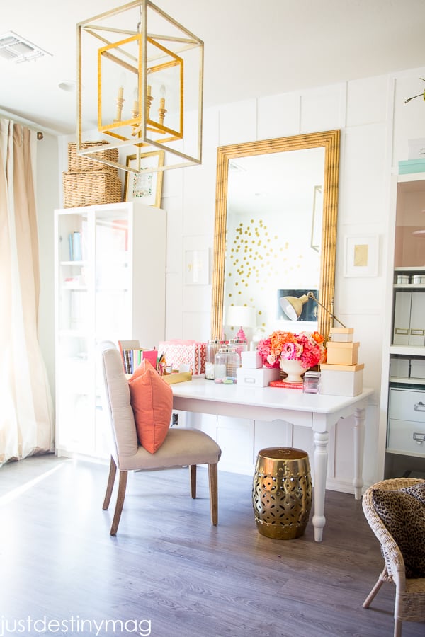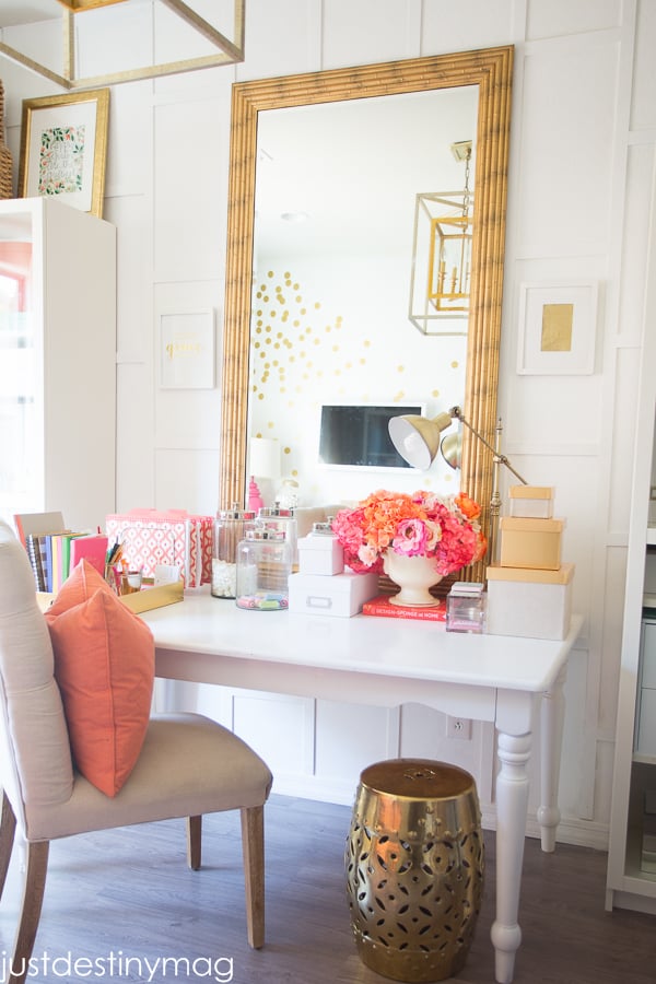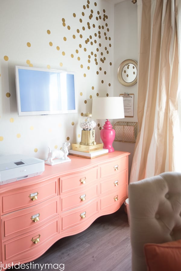 This has been a office in the making for awhile. You first saw this back in 2013 with the gold polka dot confetti wall and coral dresser. Gold and Coral. That went viral real quick and since then I see them EVERYWHERE!! I almost took it down because I like my spaces to be a little bit different, but I just couldn’t let it go quite yet. It’s just so pretty. You’ll see that my style is pretty neutral with pops of color and by color I mean green:0) I LOVE muted tones. But when it came to my office I wanted something a little more girly and this color combination was just perfect.